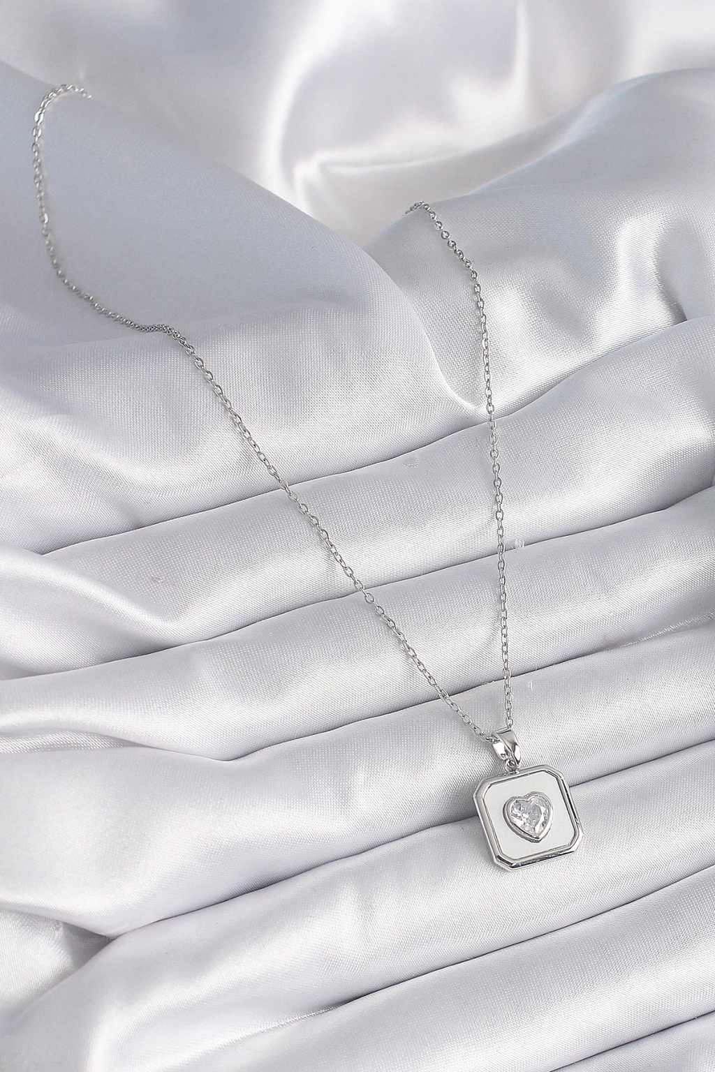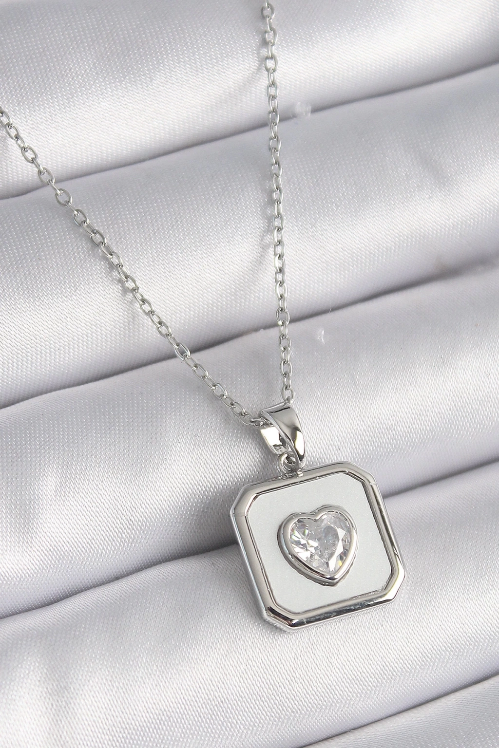 BFS 316L Çelik Gümüş Renk Kare Madalyon Kalp Zirkon Taş İşleme Kadın Kolye