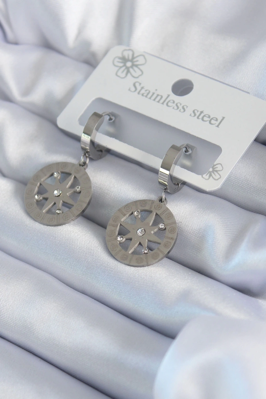BFS 316L Çelik Gümüş Renk Kutup Yıldızı Model Zirkon Taş İşleme Detay Kadın Küpe