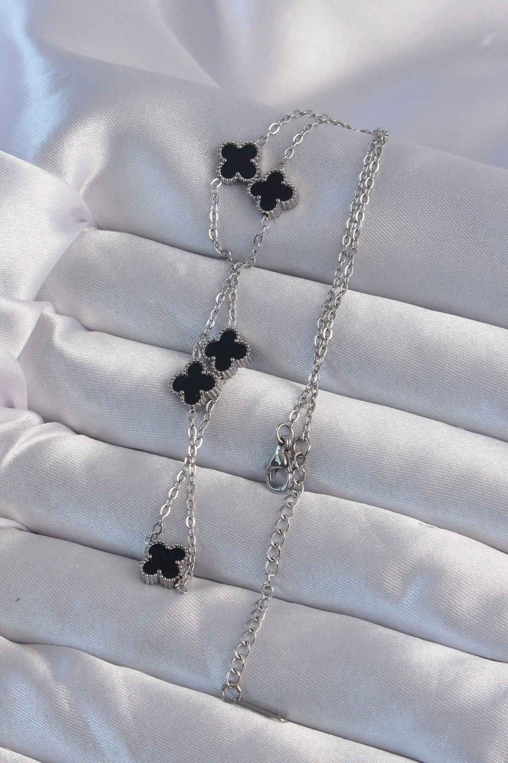 BFS 316L Çelik Gümüş Renk Minimal Siyah Mineli Yonca Kolye