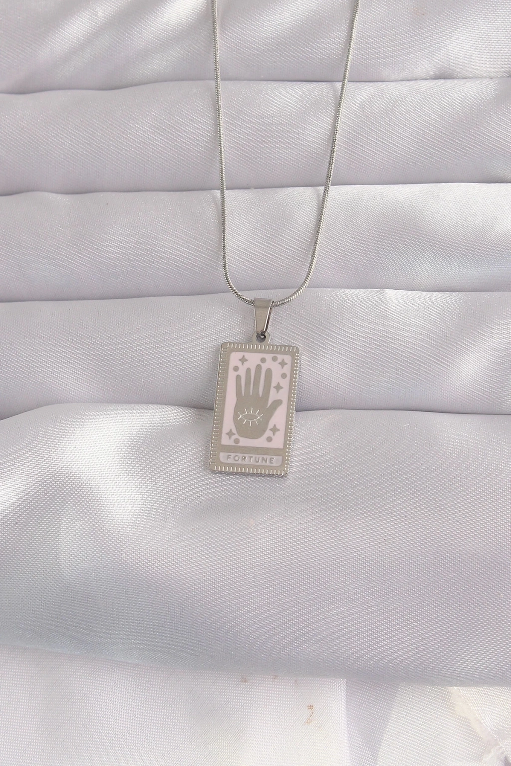 BFS 316L Çelik Gümüş Renk Pembe Mineli El Figür Tarot Kolye