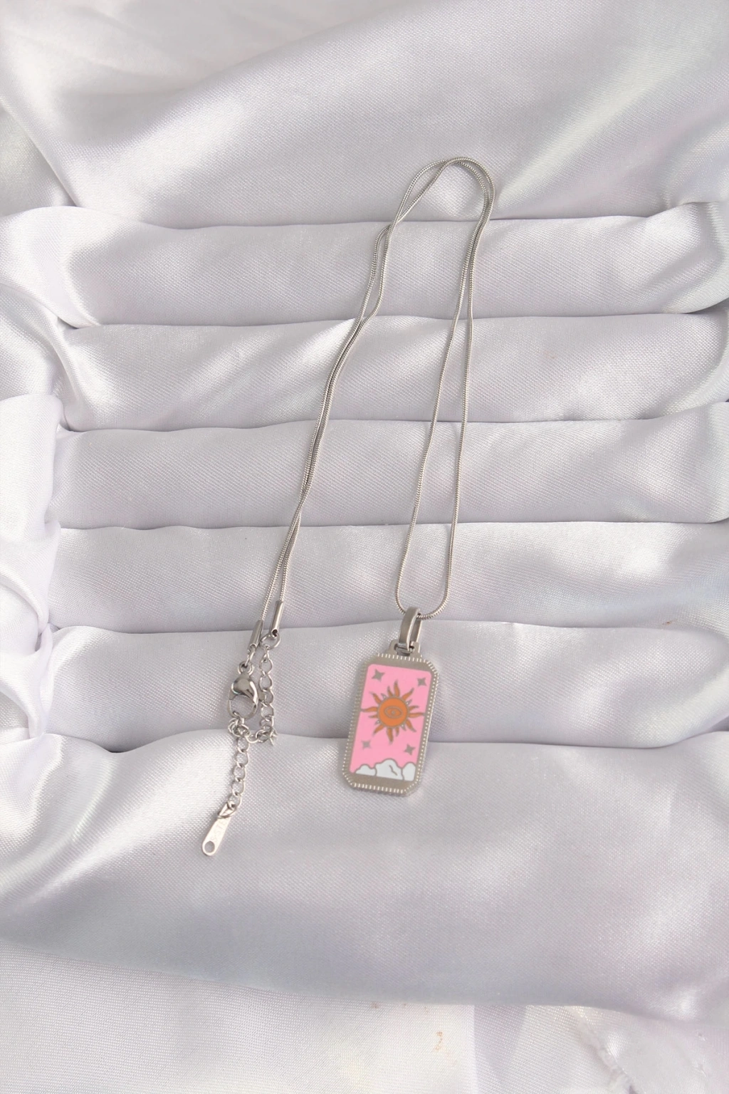 BFS 316L Çelik Gümüş Renk Pembe Mineli Güneş Model Tarot Kolye