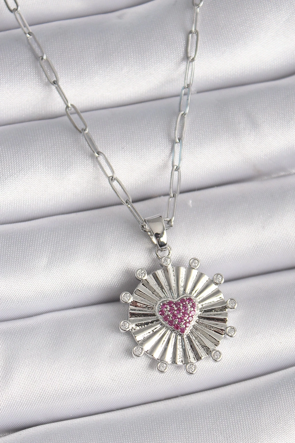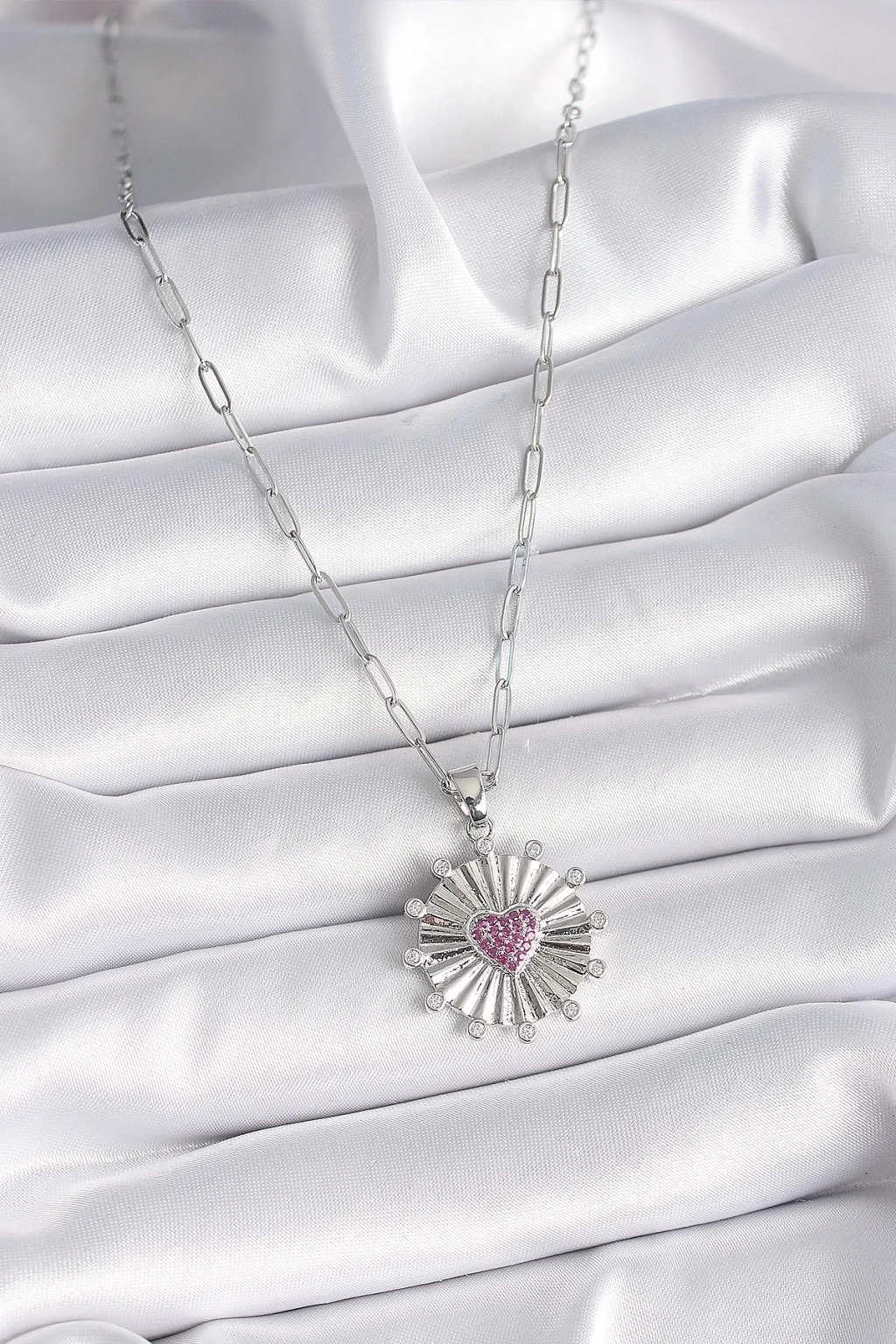 BFS 316L Çelik Gümüş Renk Pembe Zirkon Taşlı Kalp İşleme Madalyon Model Kadın Kolye