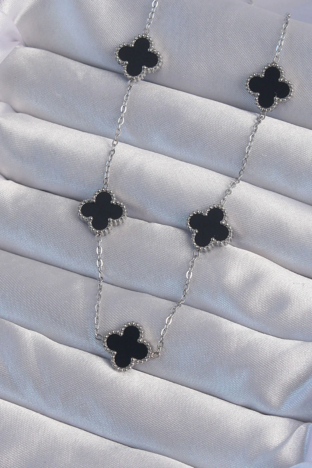 BFS 316L Çelik Gümüş Renk Siyah Mineli Yonca Kolye