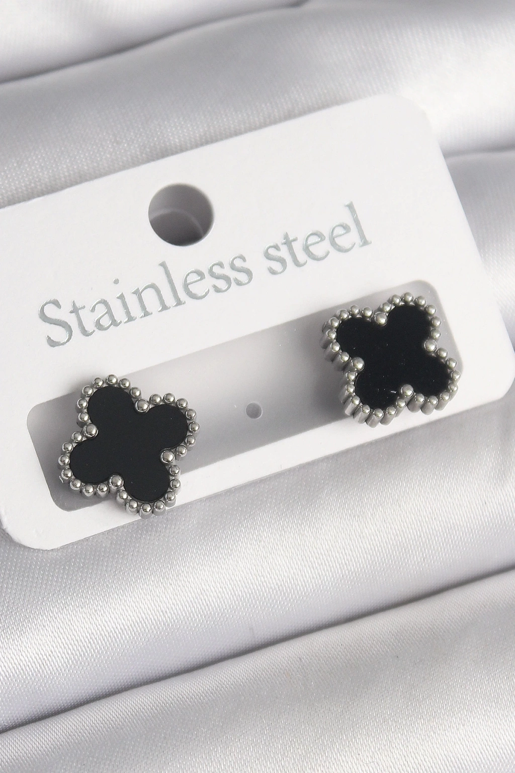 BFS 316L Çelik Gümüş Renk Siyah Yonca Model Kadın Küpe