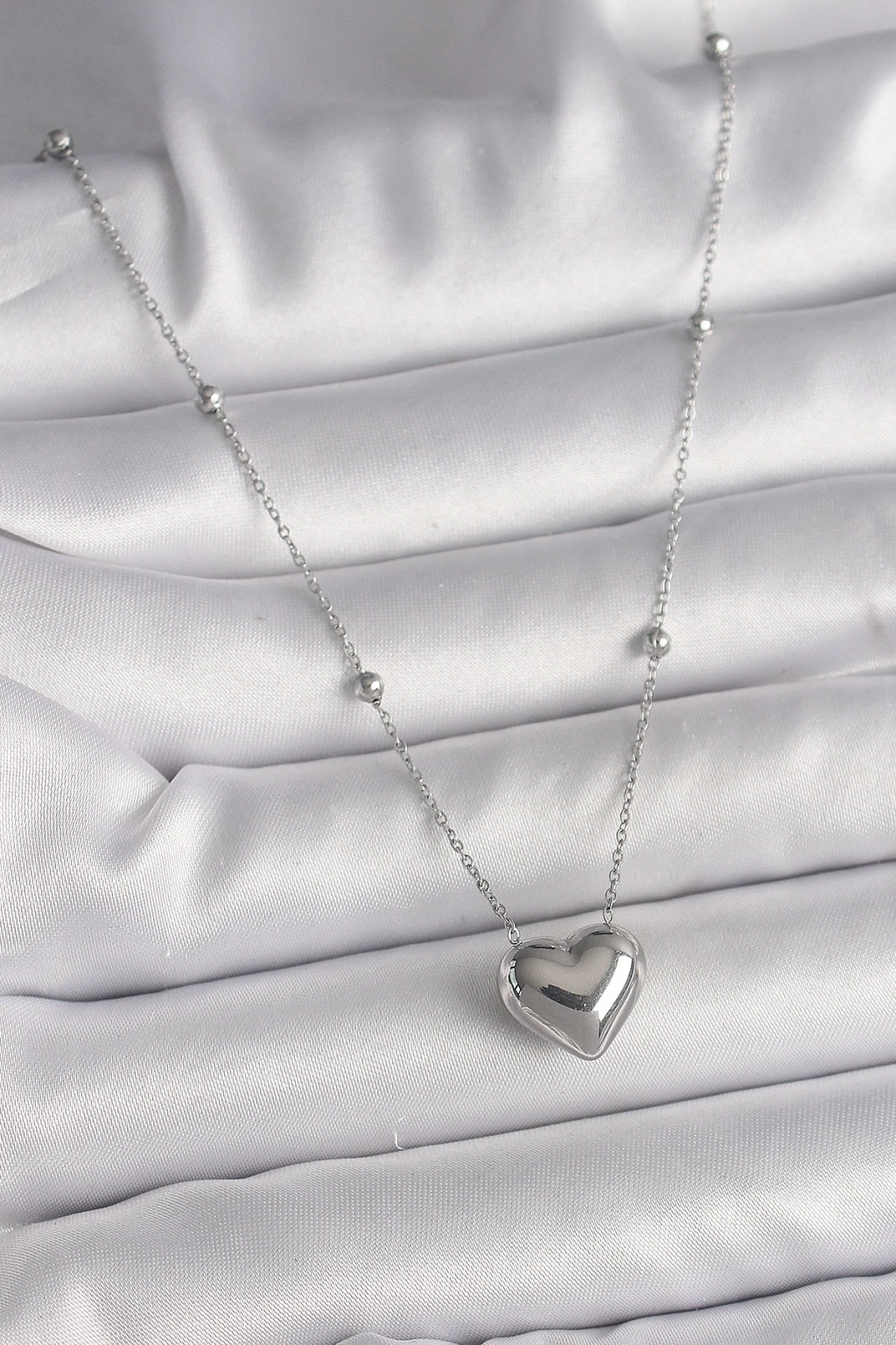 BFS 316L Çelik Gümüş Renk Topçuk Detay Zincir Kalp Model Kadın Kolye