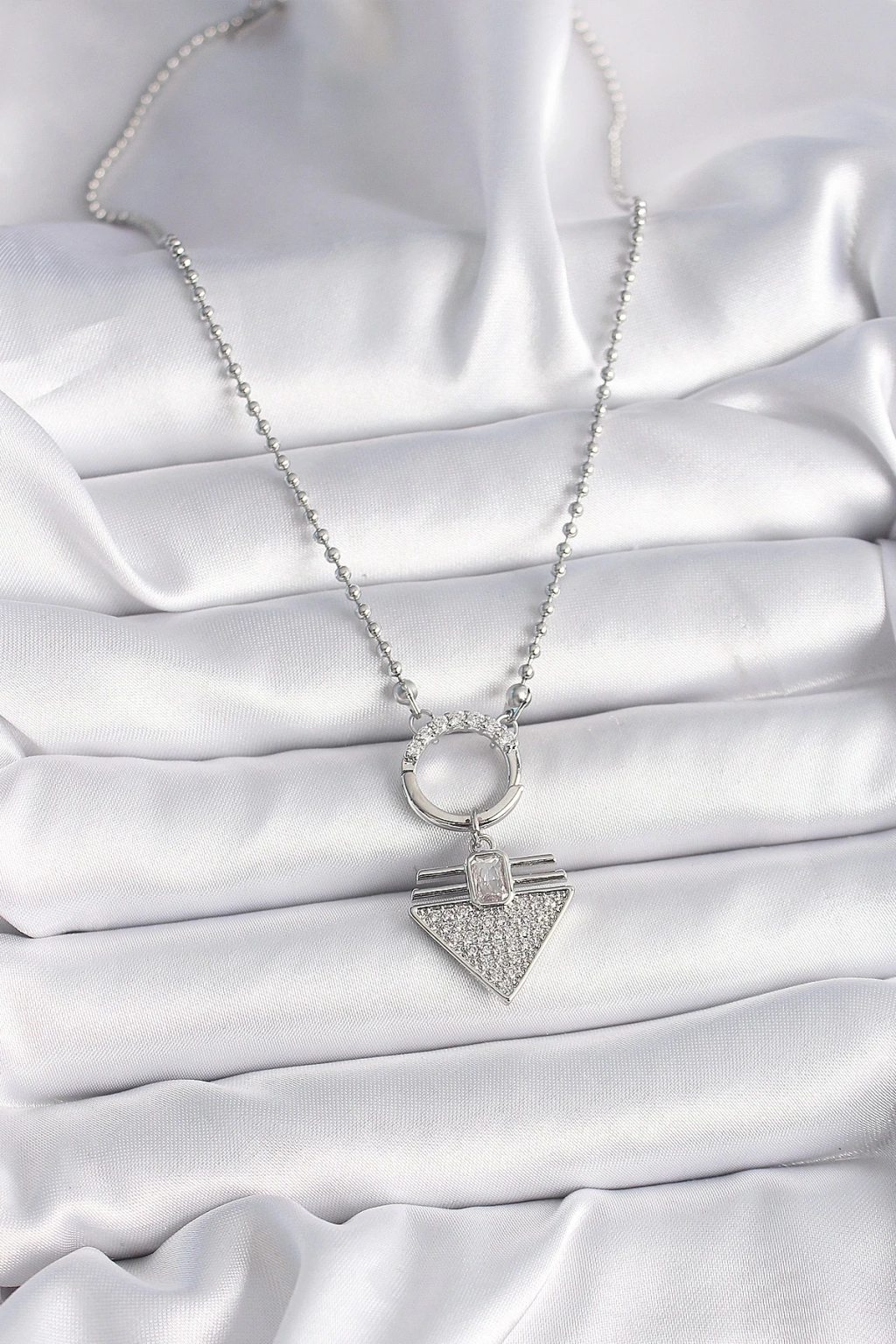 BFS 316L Çelik Gümüş Renk Topçuk Zincir Zirkon Taşlı Üçgen Model Kadın Kolye