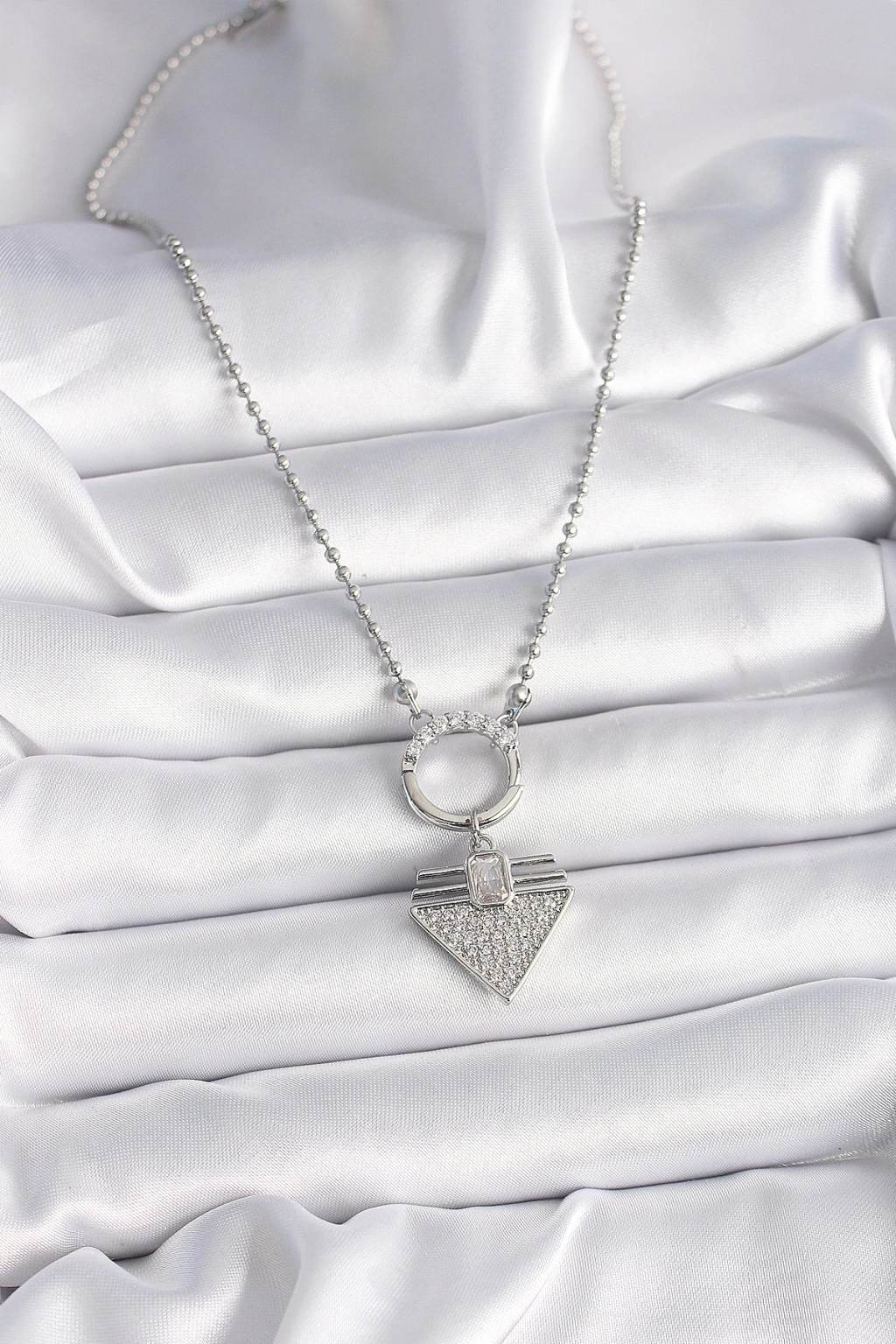 BFS 316L Çelik Gümüş Renk Topçuk Zincir Zirkon Taşlı Üçgen Model Kadın Kolye