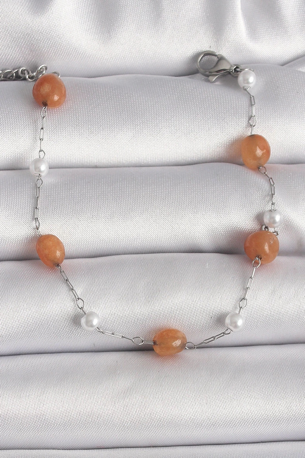 BFS 316L Çelik Gümüş Renk Turuncu Doğaltaş Model İnci Detay Kadın Bileklik