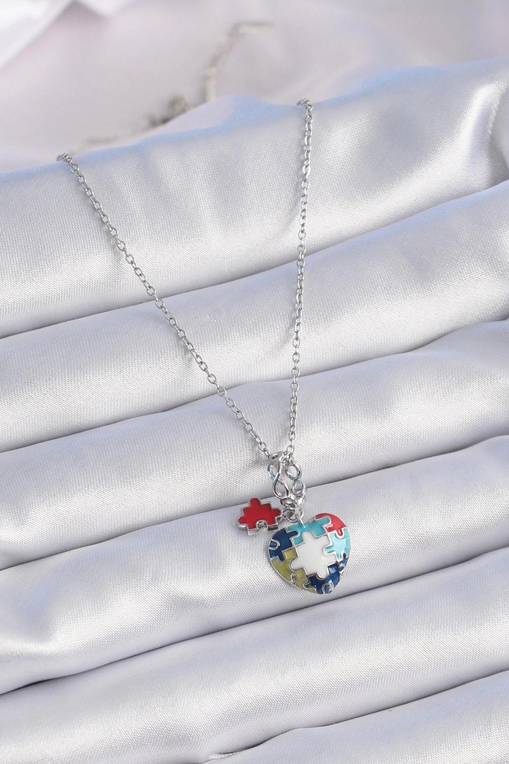 BFS 316L Çelik Gümüş Renk Yapboz Motif Kalp Figür Charm Model Kadın Kolye