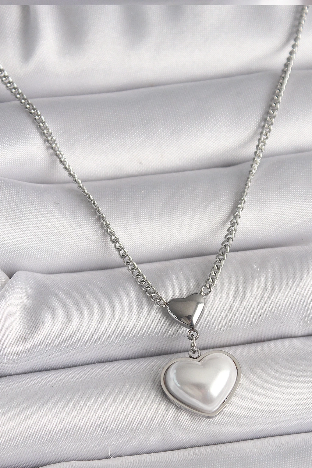 BFS 316L Çelik Gümüş Renk Zincir 3D Kalp Model Kadın Kolye