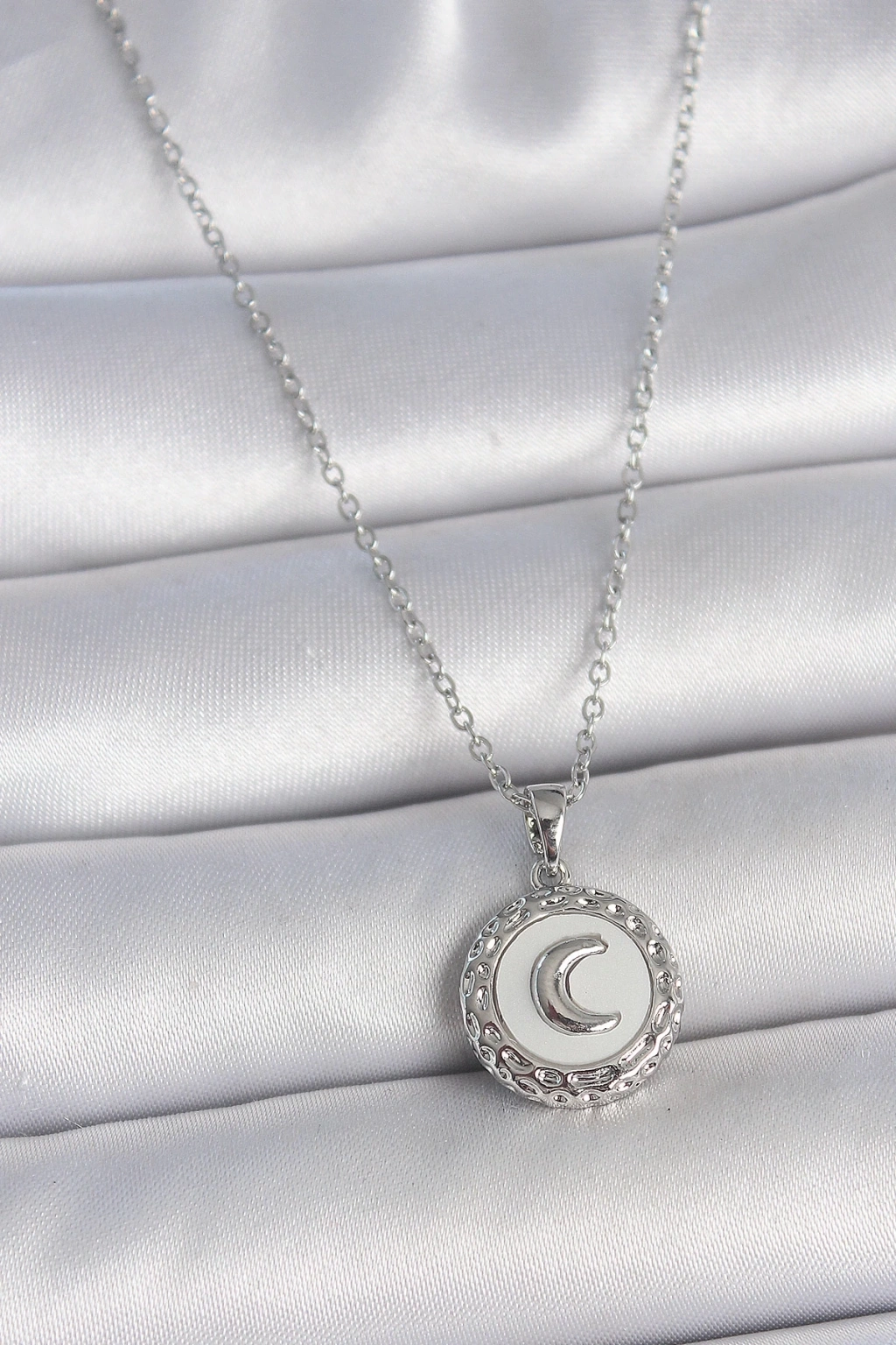 BFS 316L Çelik Gümüş Renk Zincir Beyaz Mineli Hilal İşlemeli Madalyon Model Kadın Kolye