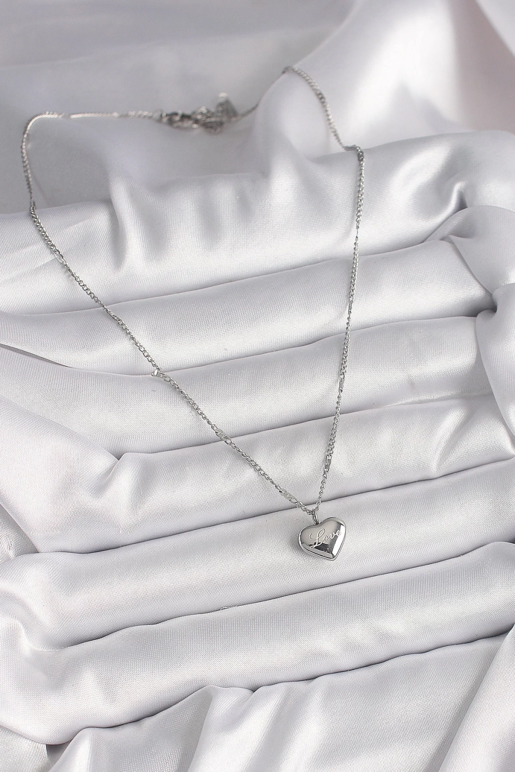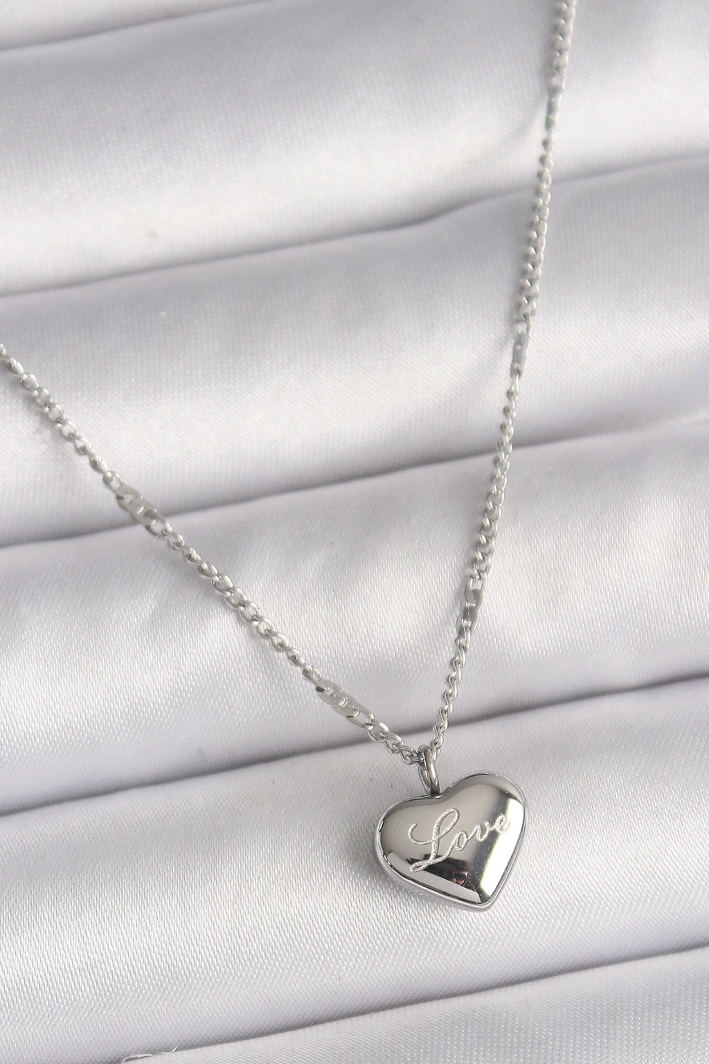 BFS 316L Çelik Gümüş Renk Zincir Love İşleme Kalp Figür Kadın Kolye