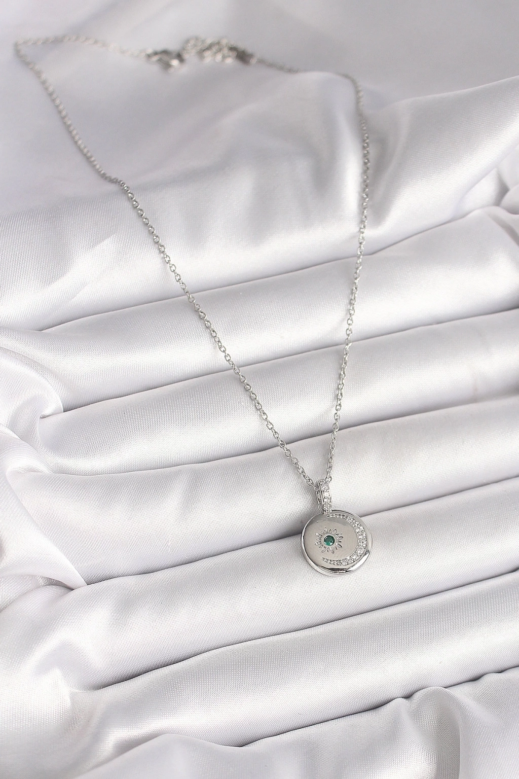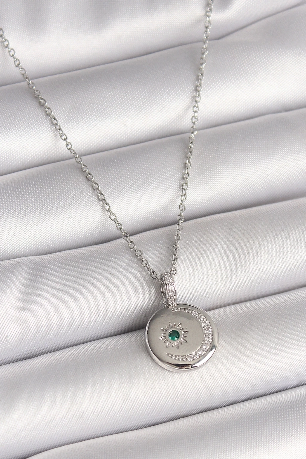 BFS 316L Çelik Gümüş Renk Zincir Madalyon Zirkon Taşlı İşlemeli Hilal Yıldız Model Kadın Kolye