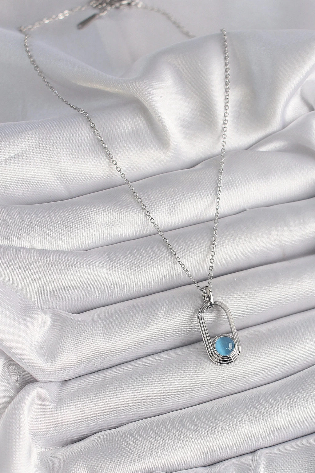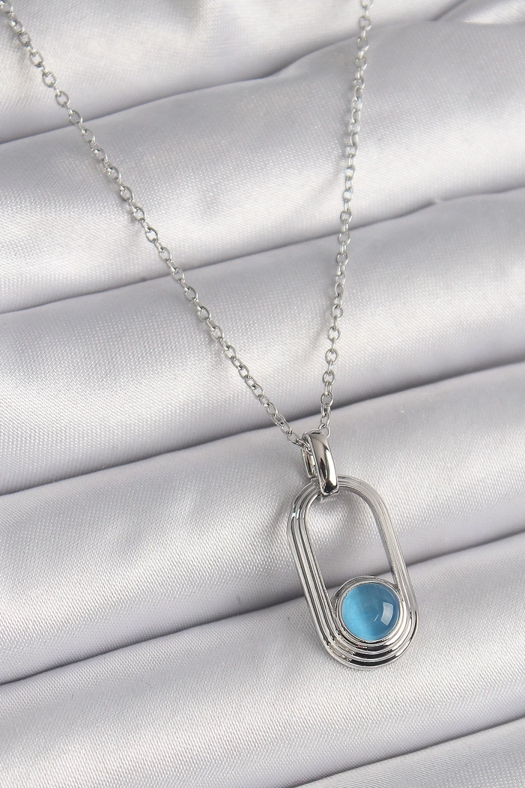 BFS 316L Çelik Gümüş Renk Zincir Mavi Kedi Göz Model Kadın Kolye