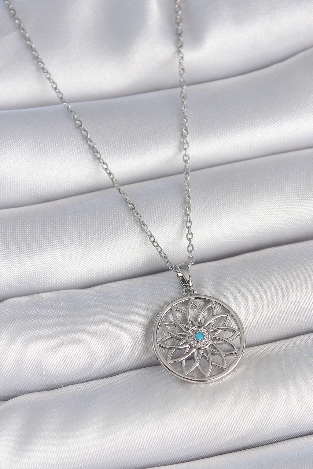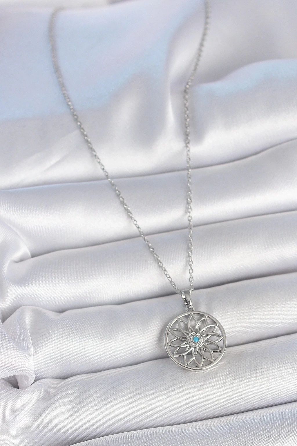 BFS 316L Çelik Gümüş Renk Zincir Mavi Taşlı Lotus Model Kadın Kolye
