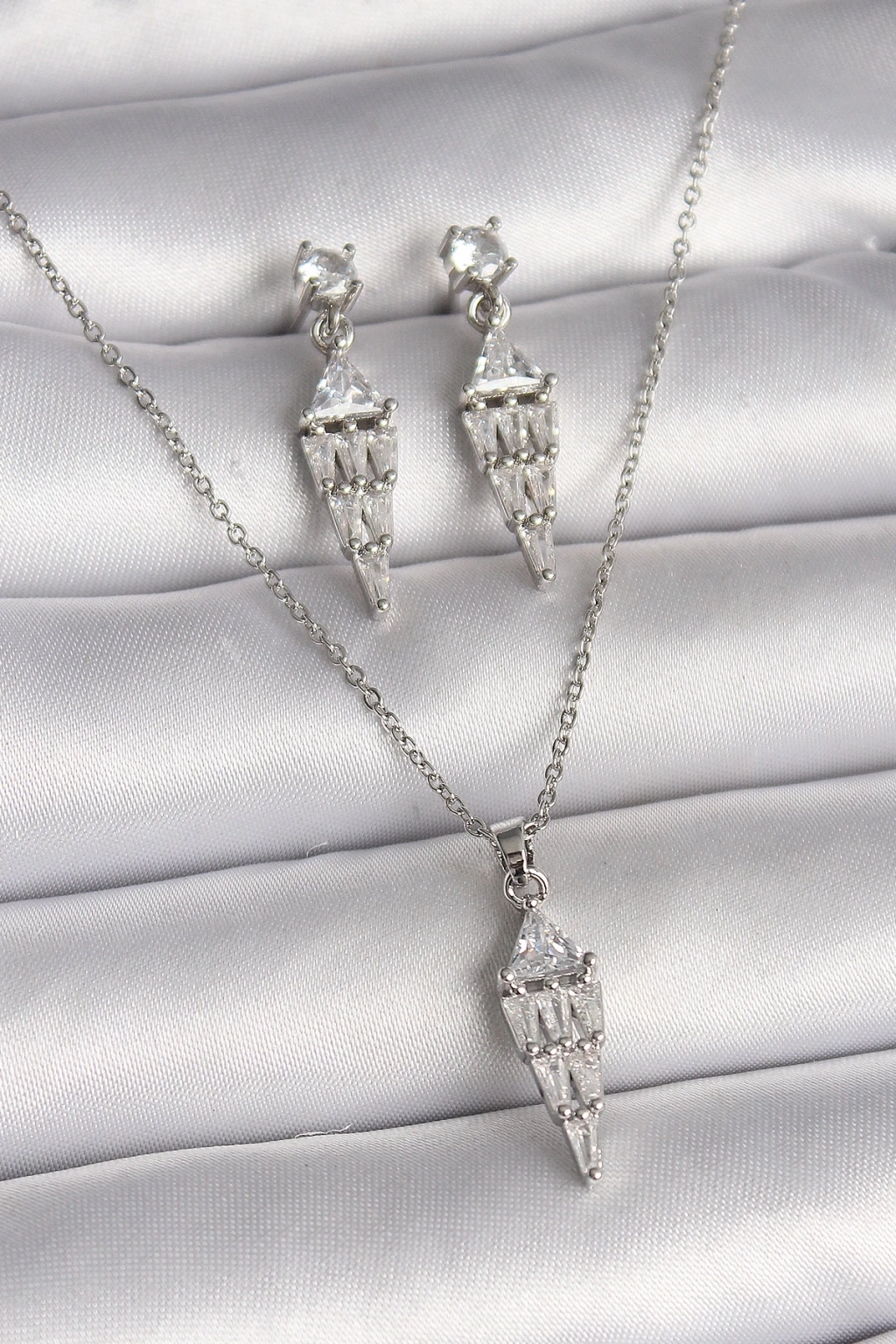 BFS 316L Çelik Gümüş Renk Zincir Sallantı Zirkon Taş Model Kadın Kolye Küpe Seti