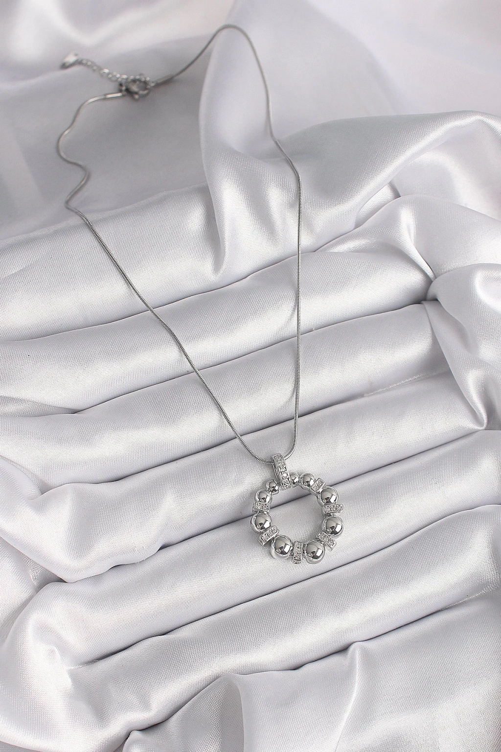 BFS 316L Çelik Gümüş Renk Zincir Zirkon Taş Detaylı Bombeli Halka Model Kadın Kolye