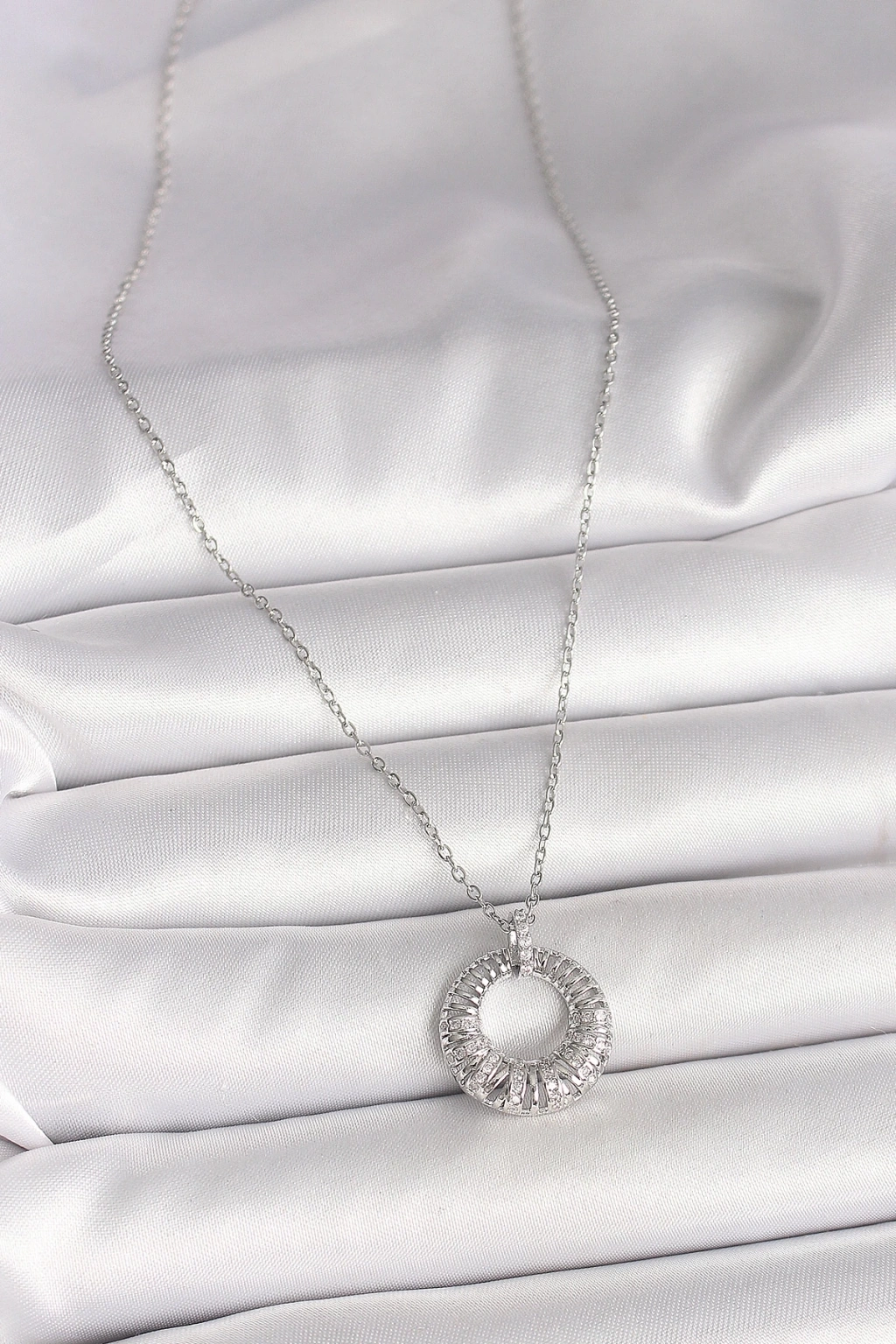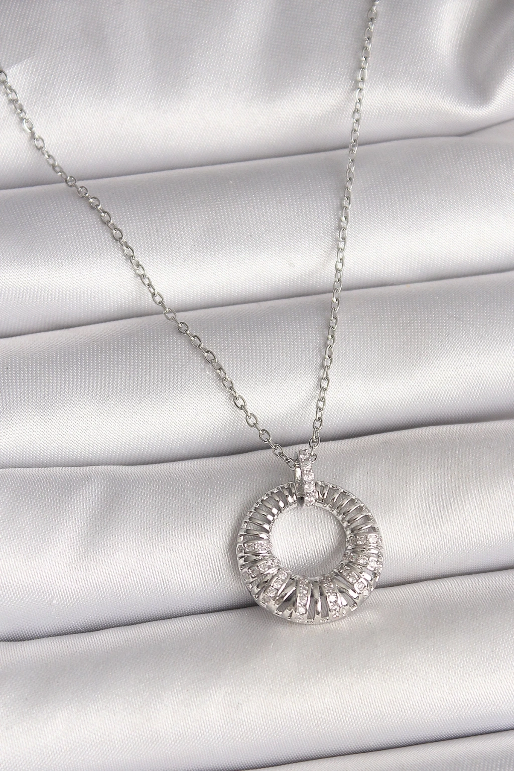 BFS 316L Çelik Gümüş Renk Zincir Zirkon Taş İşlemeli Daire Model Kadın Kolye