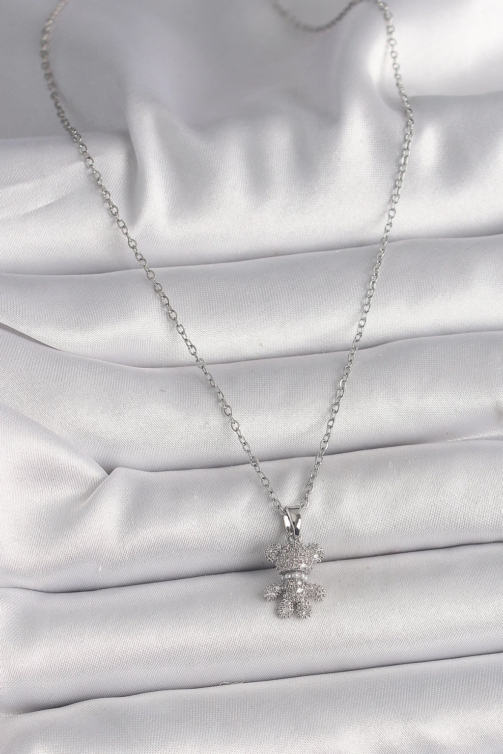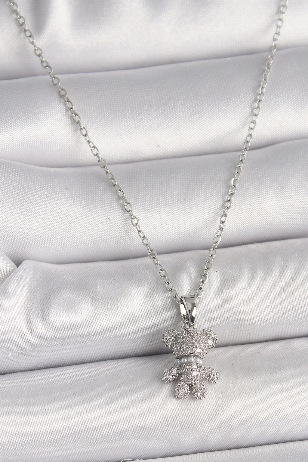 BFS 316L Çelik Gümüş Renk Zincir Zirkon Taşlı Ayıcık Figür Kadın Kolye