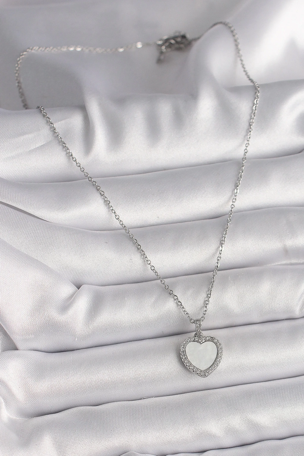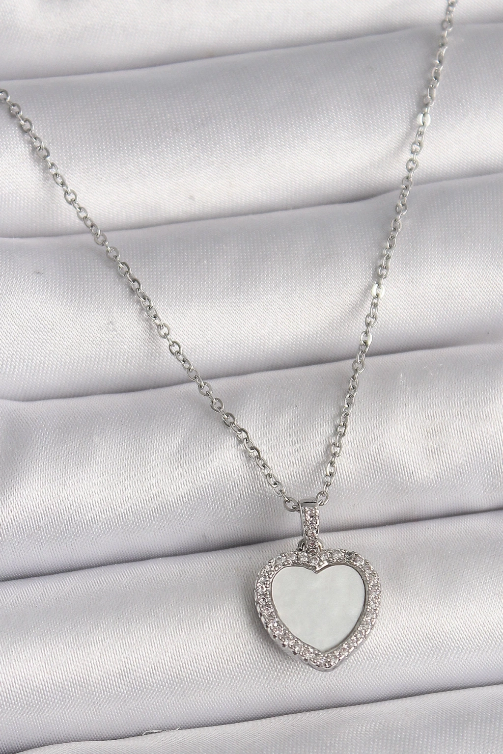 BFS 316L Çelik Gümüş Renk Zincir Zirkon Taşlı Beyaz Mineli Kalp Model Kadın Kolye
