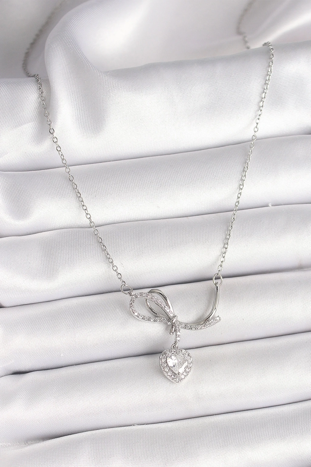 BFS 316L Çelik Gümüş Renk Zincir Zirkon Taşlı Düğüm Sallantı Kalp Figür Kadın Kolye