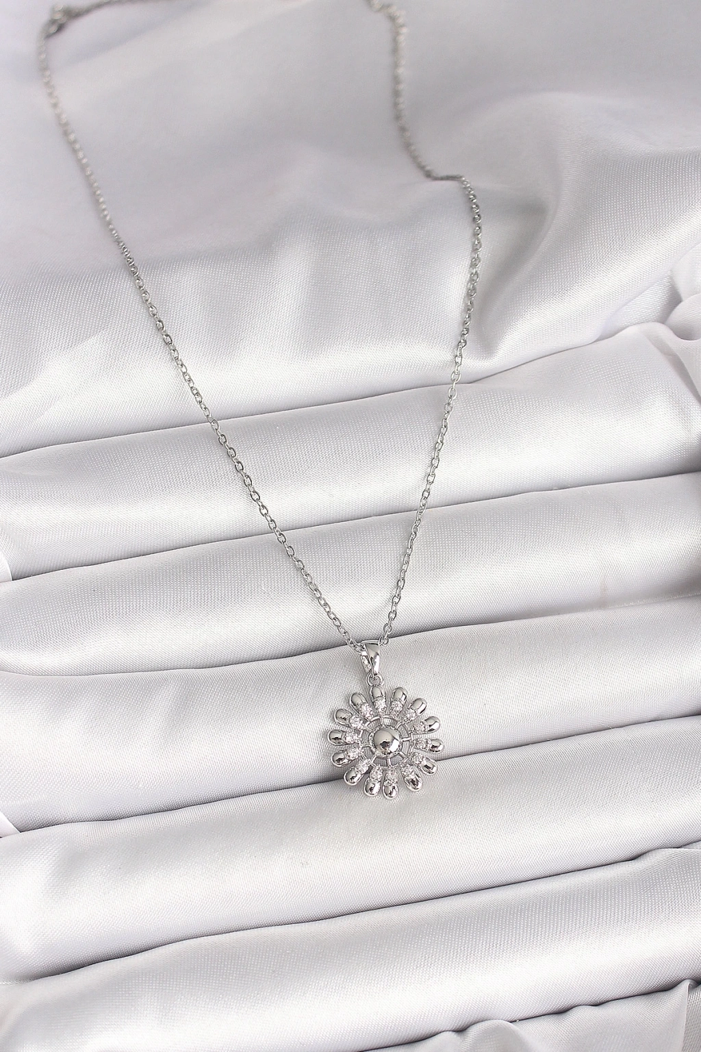 BFS 316L Çelik Gümüş Renk Zincir Zirkon Taşlı Güneş Model Kadın Kolye