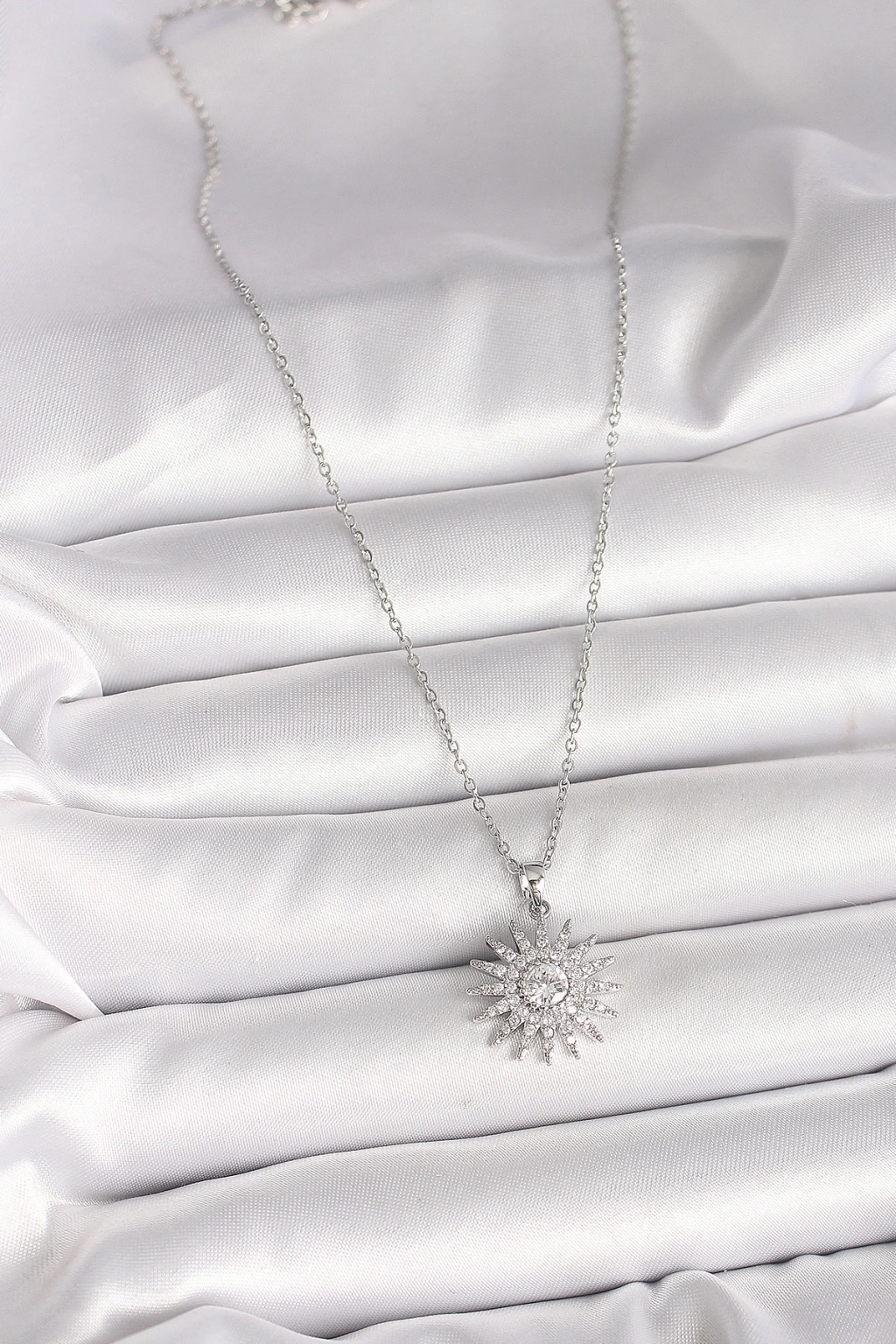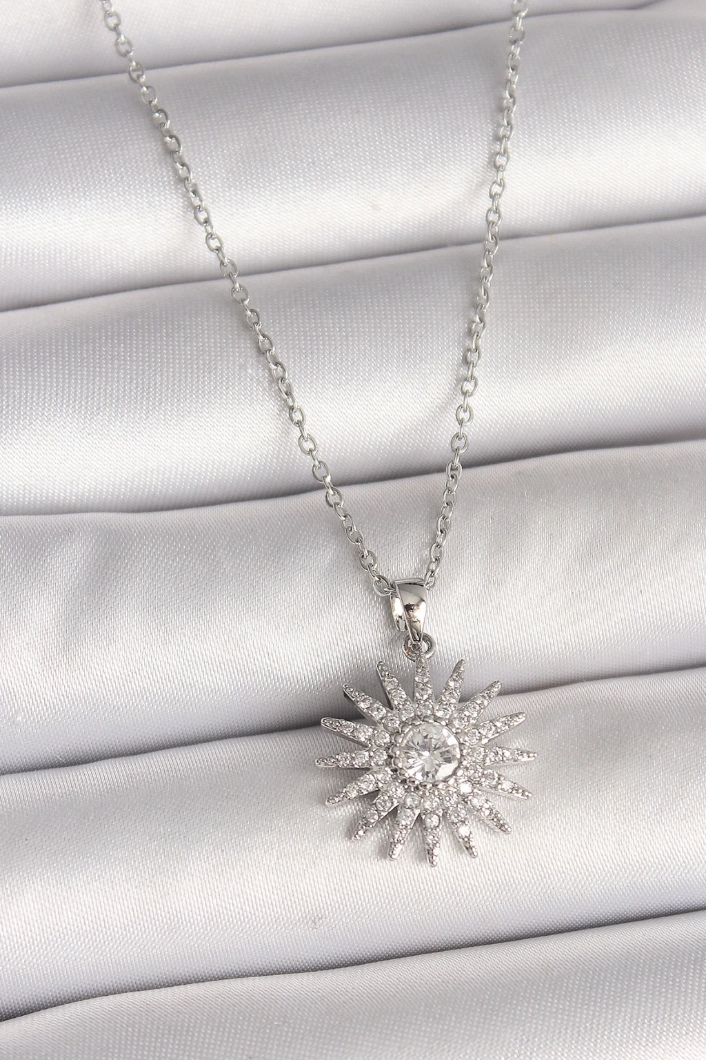 BFS 316L Çelik Gümüş Renk Zincir Zirkon Taşlı Güneş Model Kadın Kolye