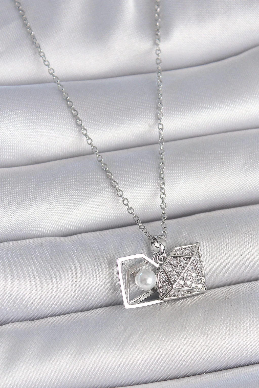 BFS 316L Çelik Gümüş Renk Zincir Zirkon Taşlı İncili Açılır Elmas Model Kadın Kolye