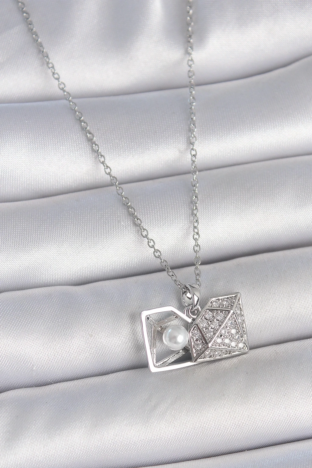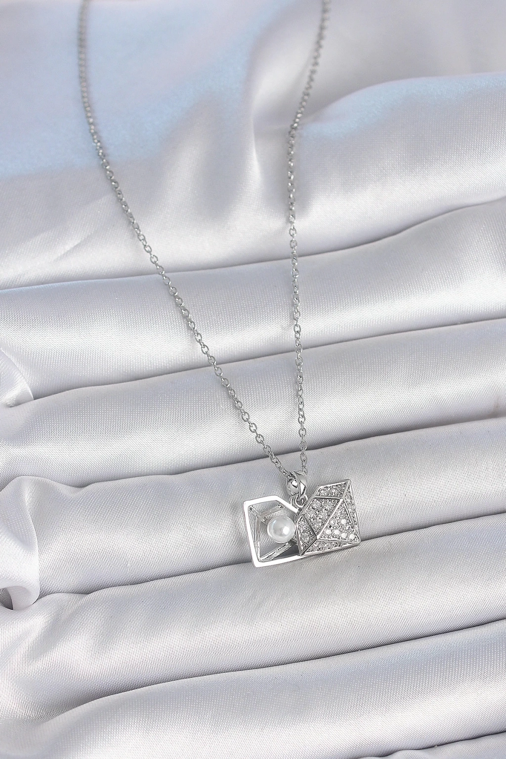 BFS 316L Çelik Gümüş Renk Zincir Zirkon Taşlı İncili Açılır Elmas Model Kadın Kolye