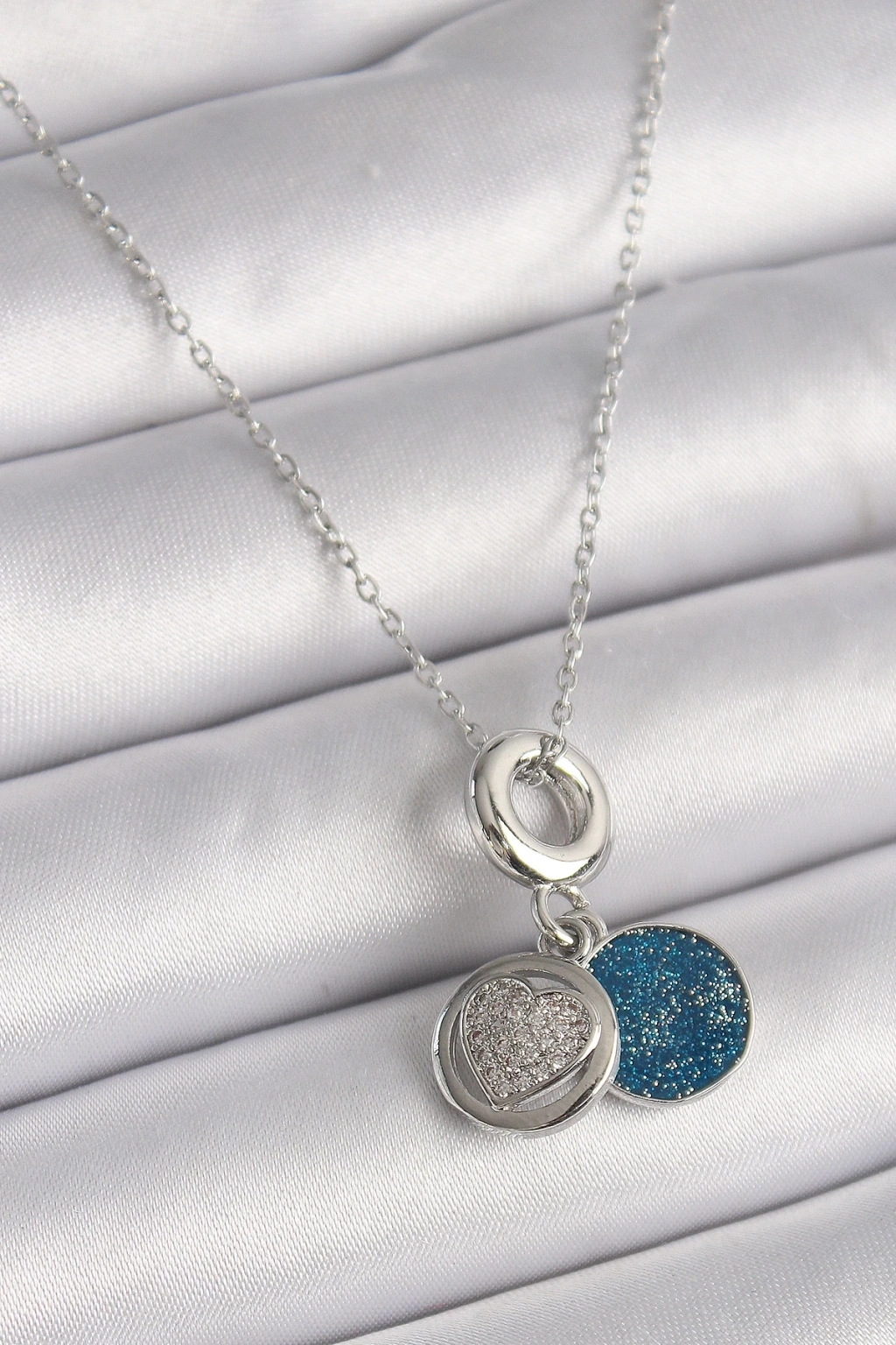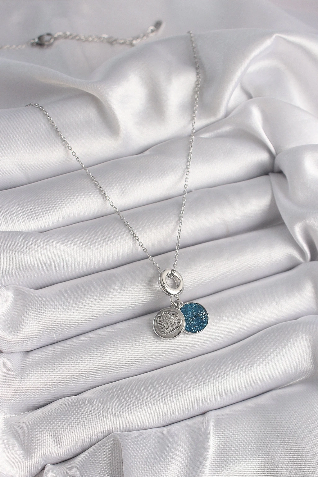 BFS 316L Çelik Gümüş Renk Zincir Zirkon Taşlı İşleme Mavi Simli Kadın Kolye