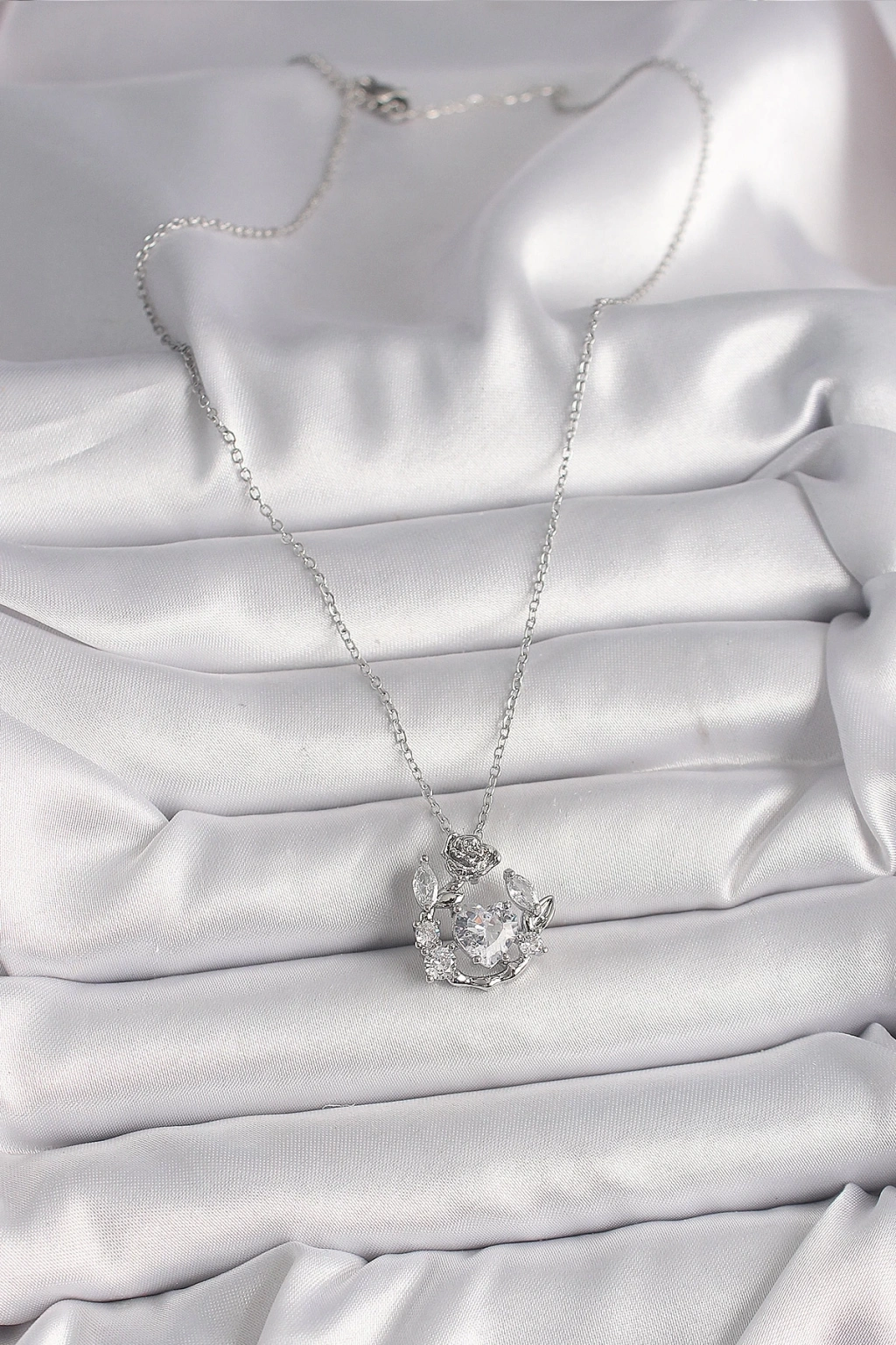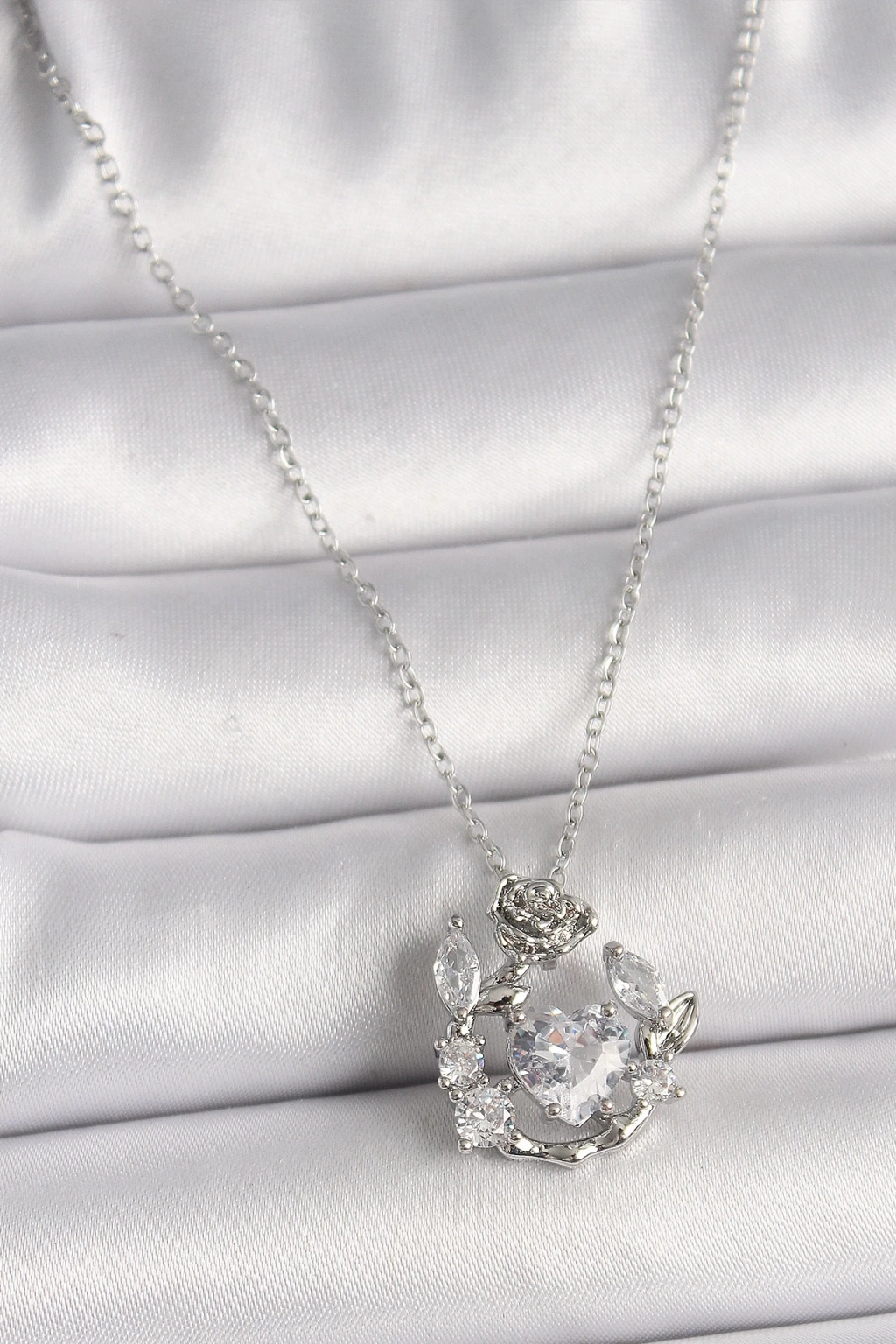 BFS 316L Çelik Gümüş Renk Zincir Zirkon Taşlı Kalp Figür Gül Detay Kadın Kolye