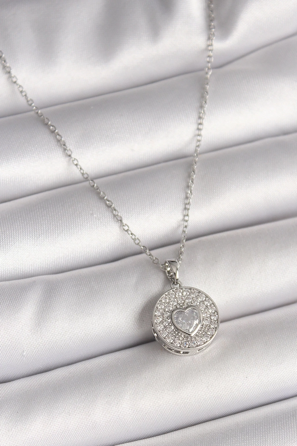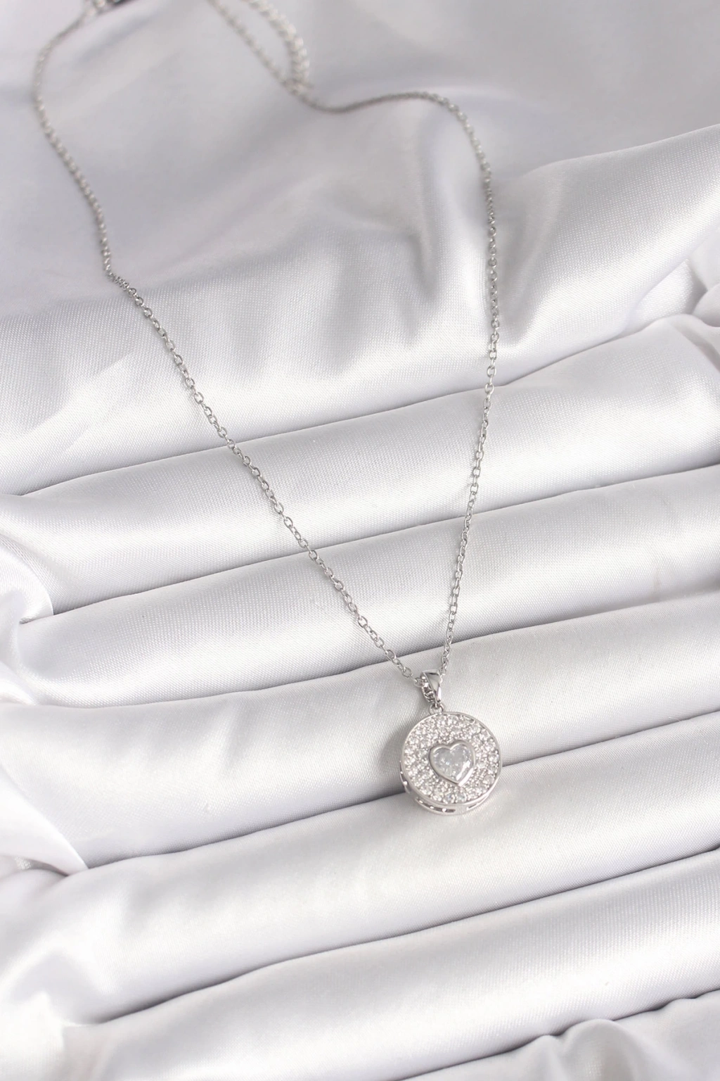 BFS 316L Çelik Gümüş Renk Zincir Zirkon Taşlı Kalp İşlemeli Madalyon Model Kadın Kolye