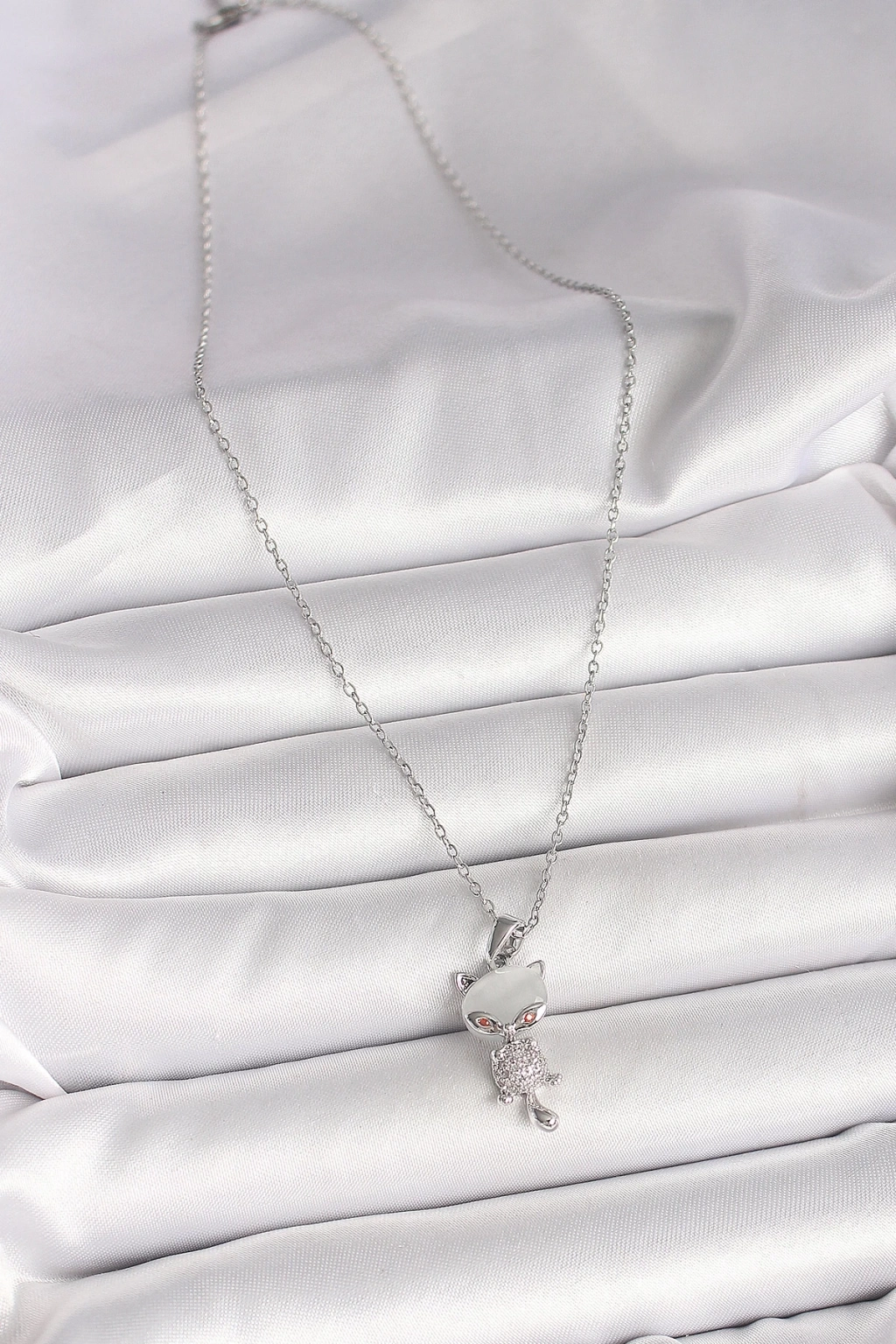 BFS 316L Çelik Gümüş Renk Zincir Zirkon Taşlı Kedi Model Kadın Kolye
