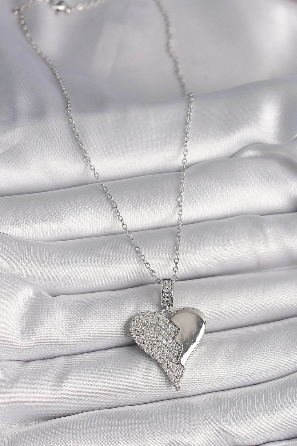 BFS 316L Çelik Gümüş Renk Zincir Zirkon Taşlı Kırık Kalp Model Kadın Kolye