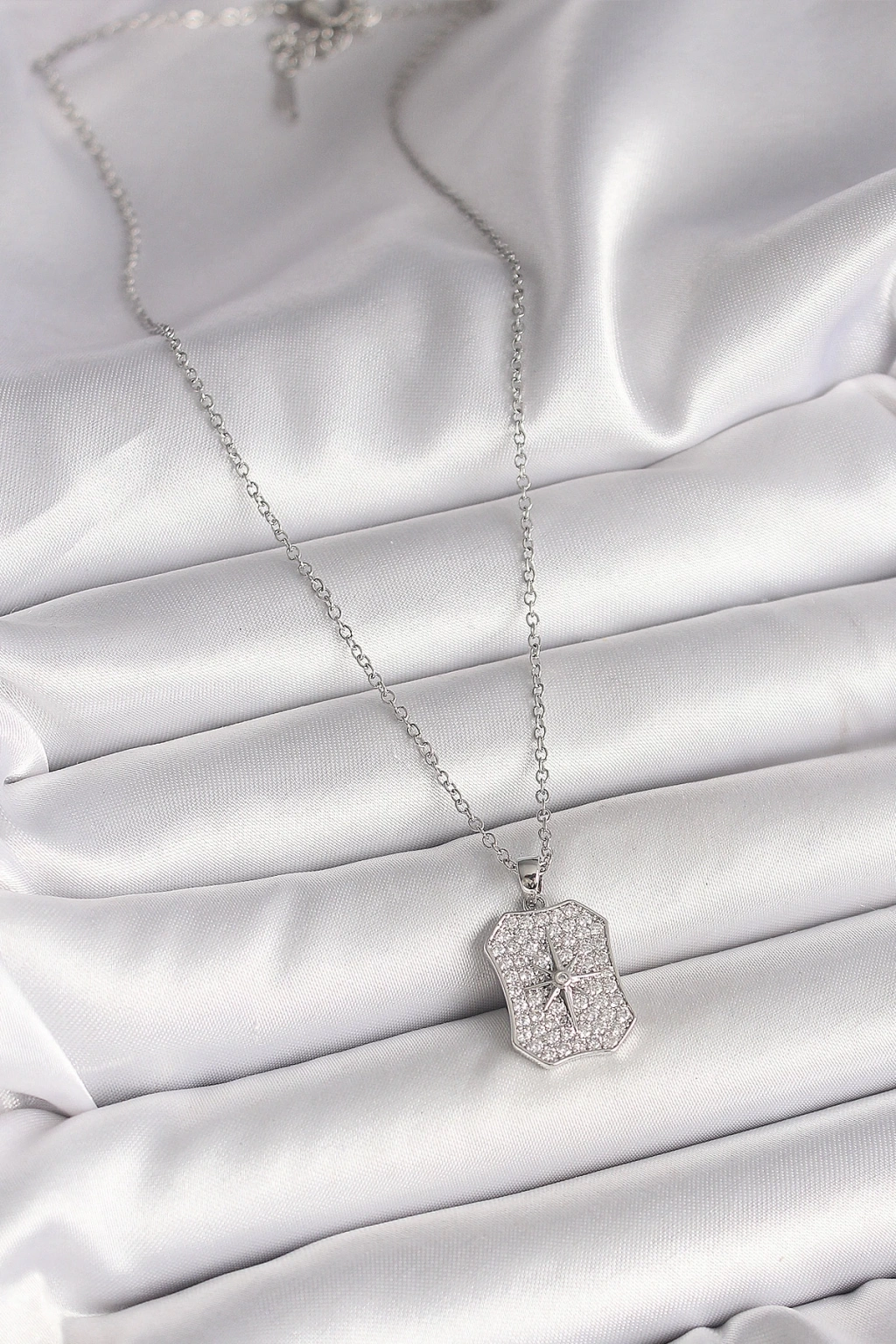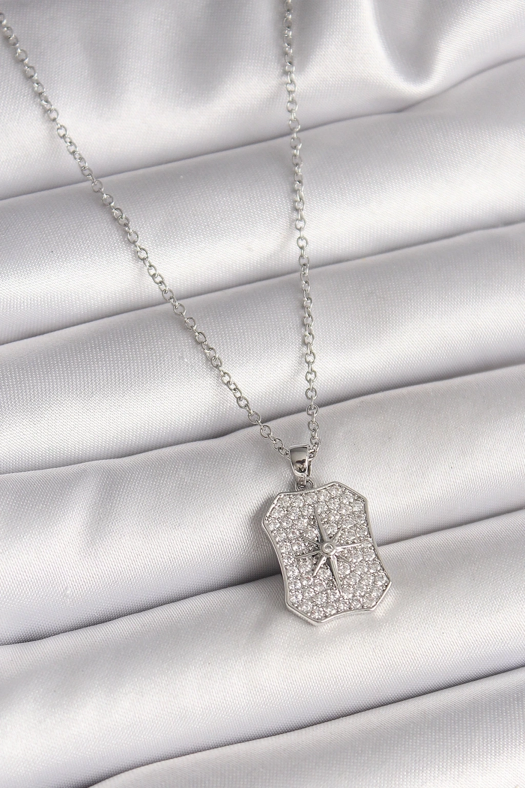 BFS 316L Çelik Gümüş Renk Zincir Zirkon Taşlı Kutup Yıldız İşlemeli Madalyon Model Kadın Kolye