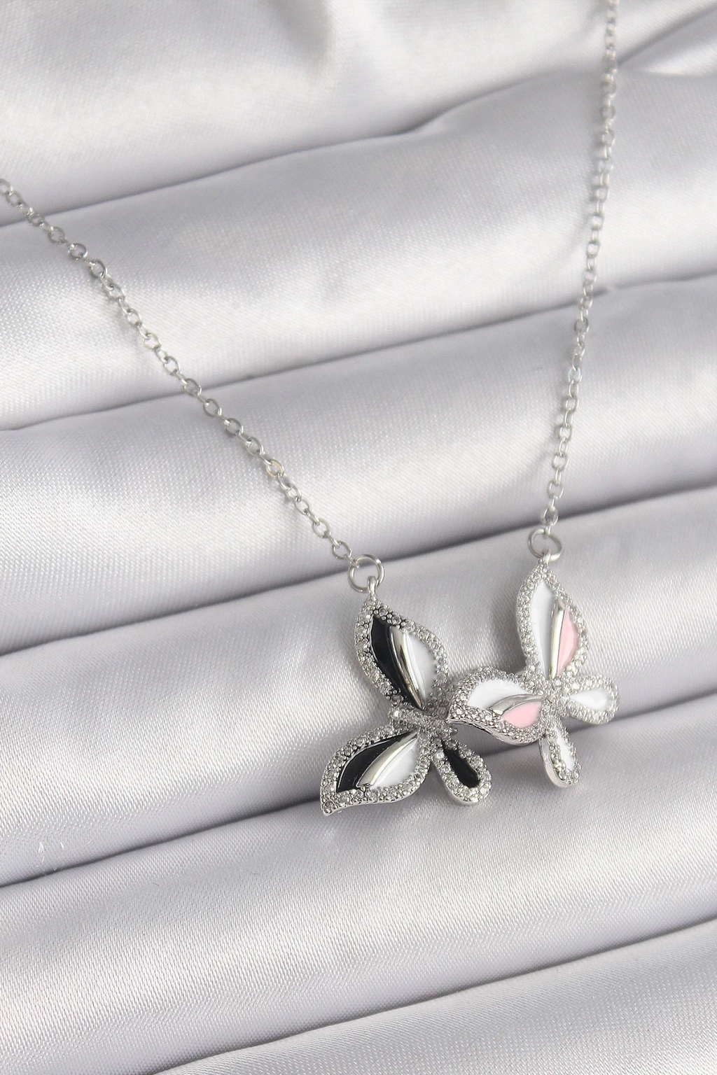 BFS 316L Çelik Gümüş Renk Zincir Zirkon Taşlı Renkli Kelebek Model Kadın Kolye