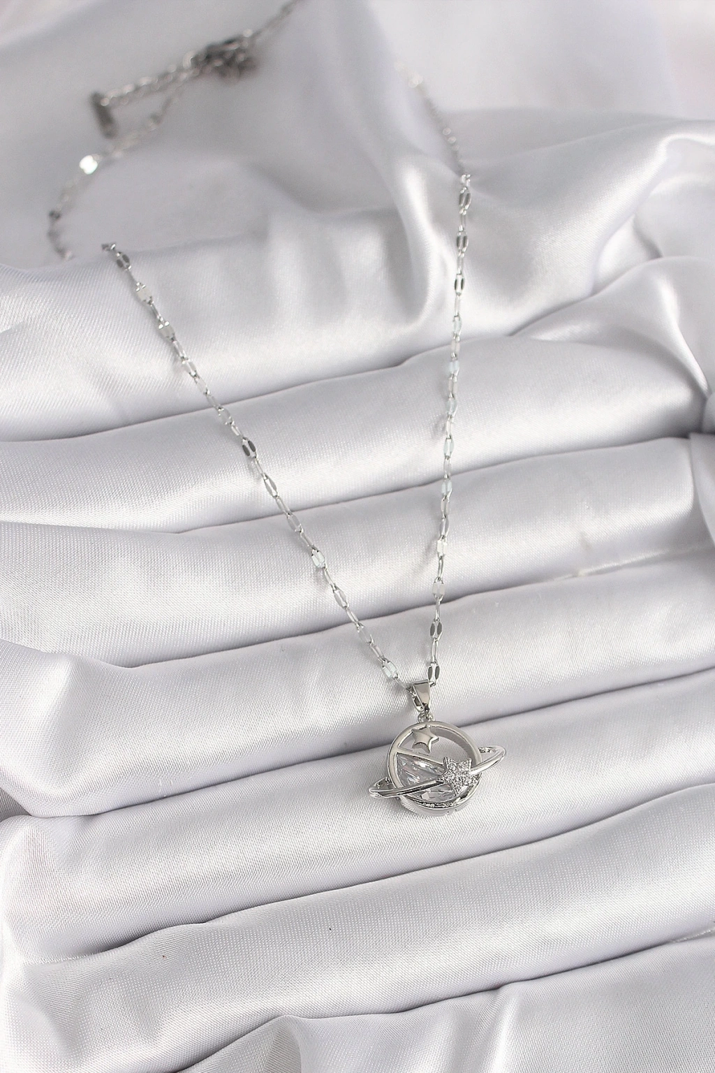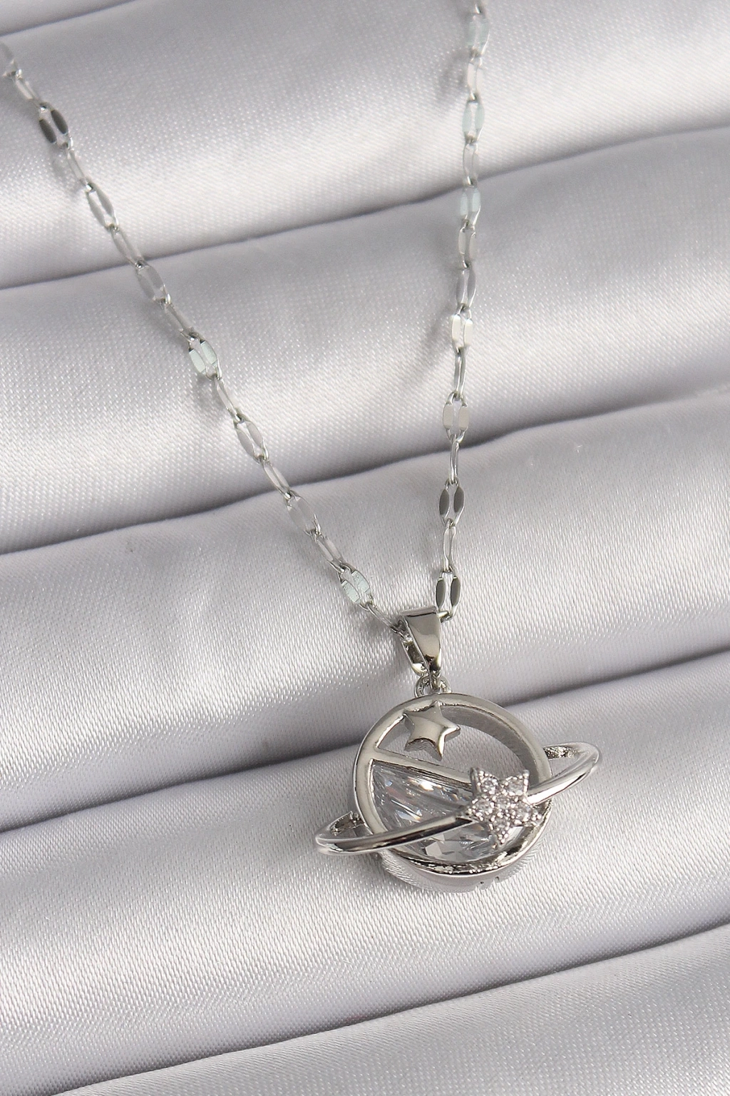 BFS 316L Çelik Gümüş Renk Zincir Zirkon Taşlı Yıldız Detay Gezegen Model Kadın Kolye