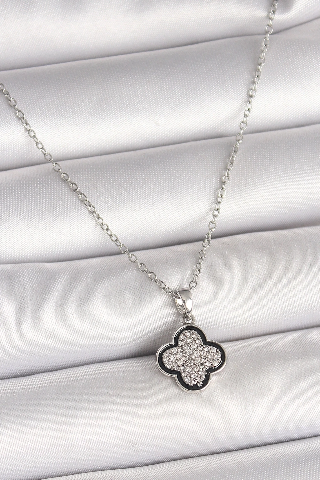 BFS 316L Çelik Gümüş Renk Zincir Zirkon Taşlı Yonca Model Kadın Kolye