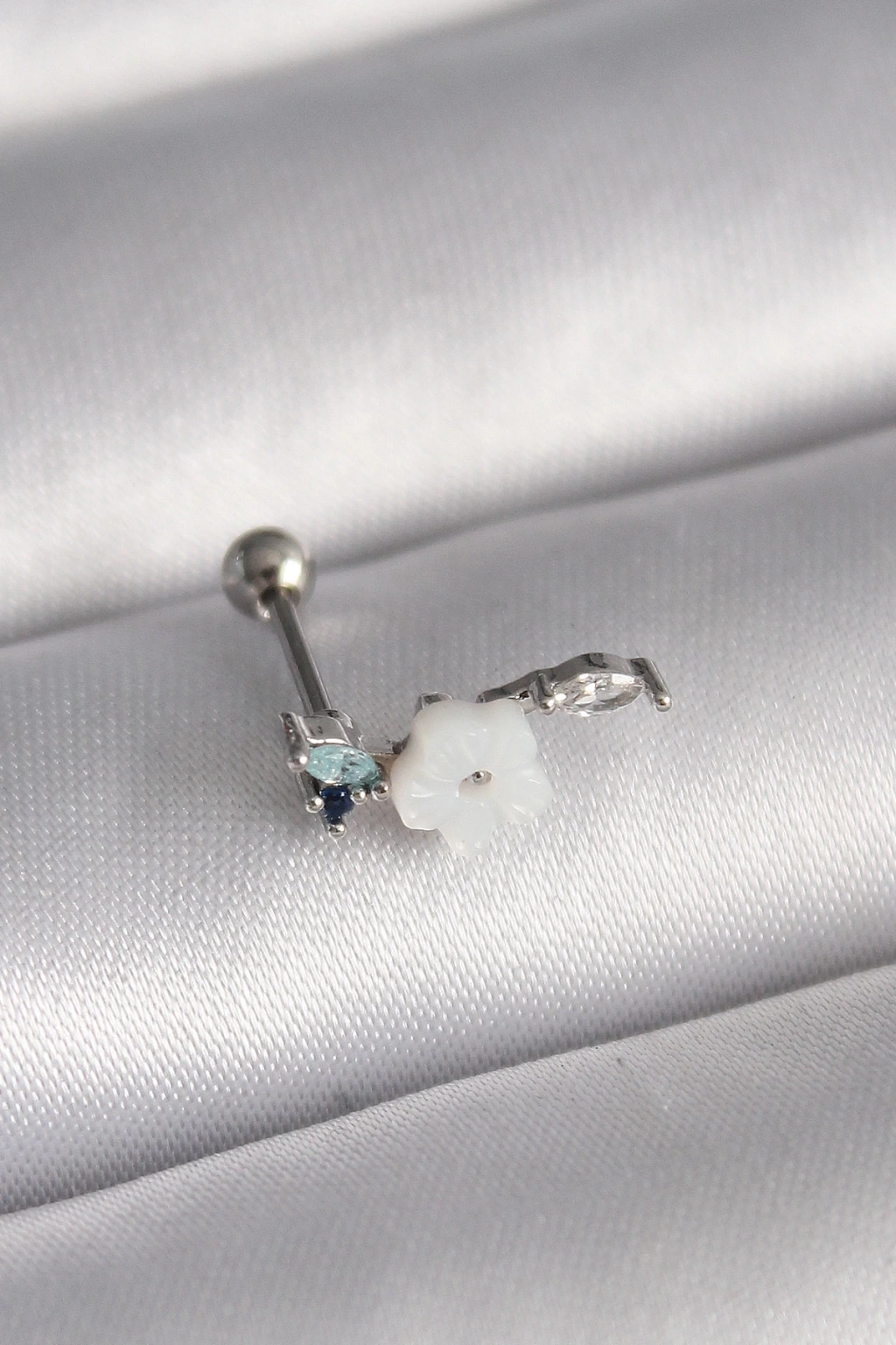 BFS 316L Çelik Gümüş Renk Zirkon Taş Detay Beyaz Çiçek Model Tragus Piercing