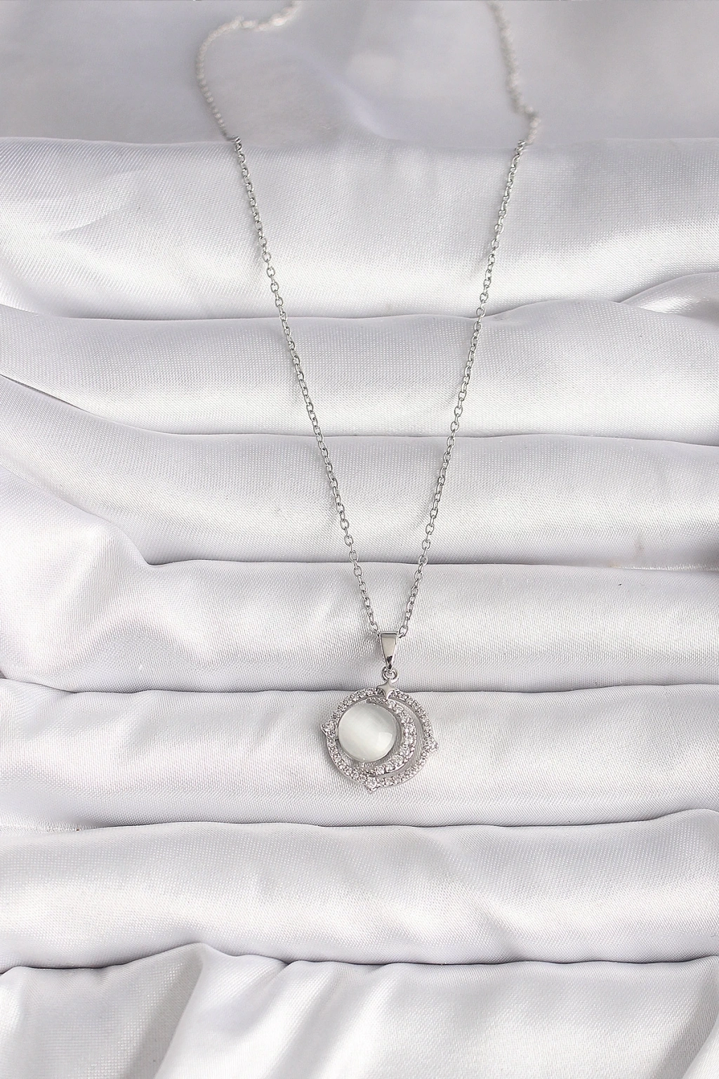 BFS 316L Çelik Gümüş Renk Zirkon Taşlı Beyaz Sedefli Hilal Model Kadın Kolye