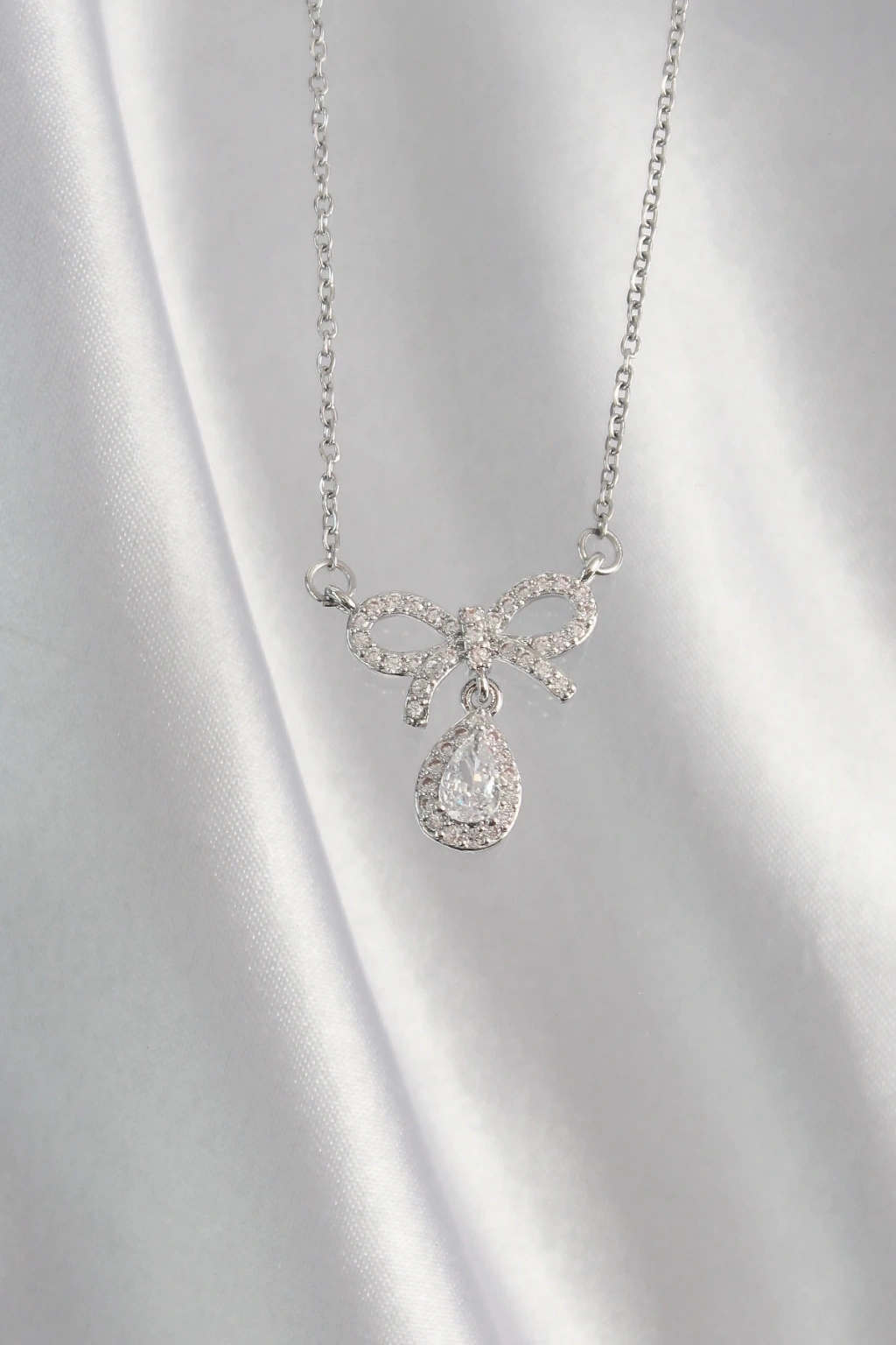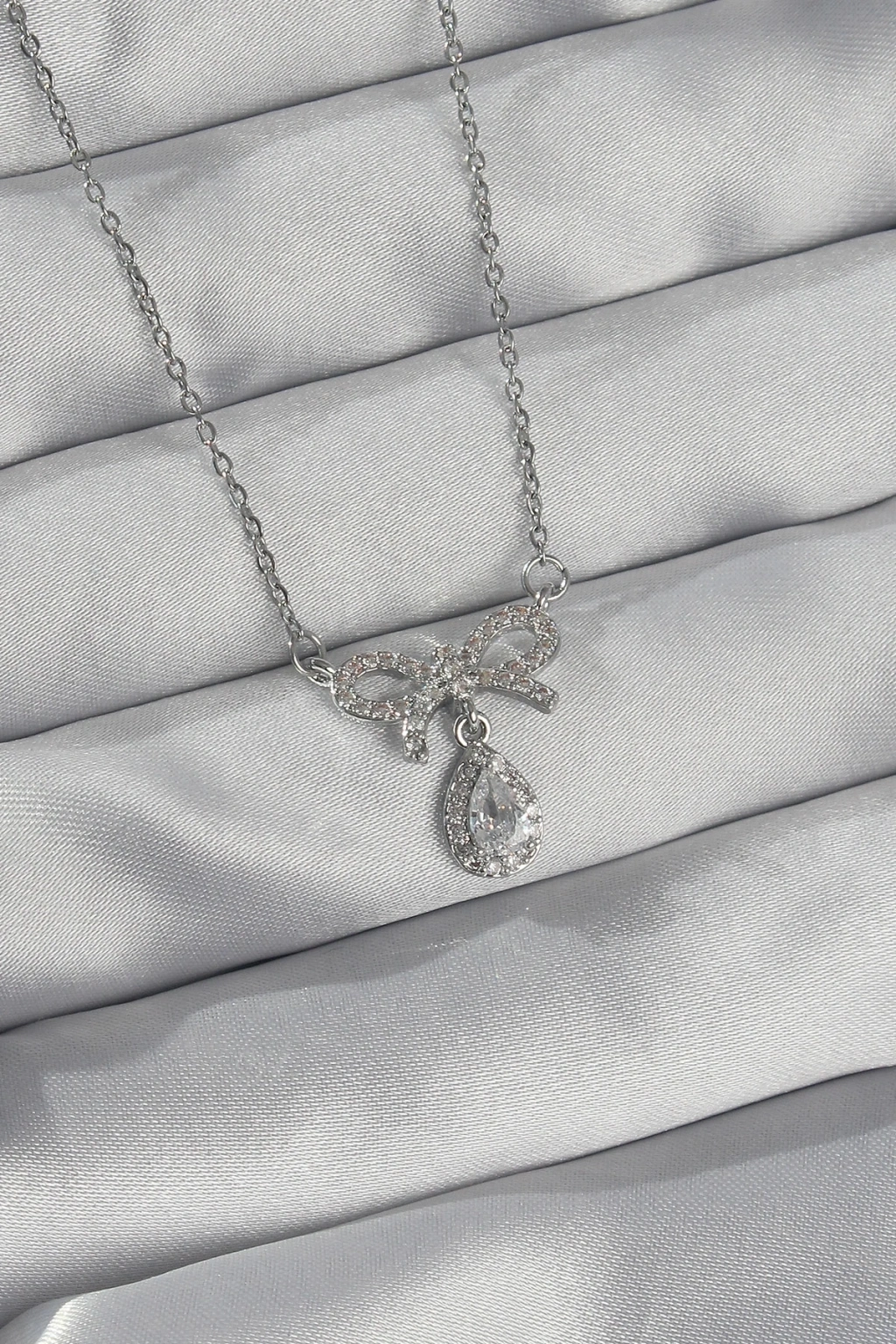 BFS 316L Çelik Gümüş Renk Zirkon Taşlı Fiyonk Detay Damla Kolye