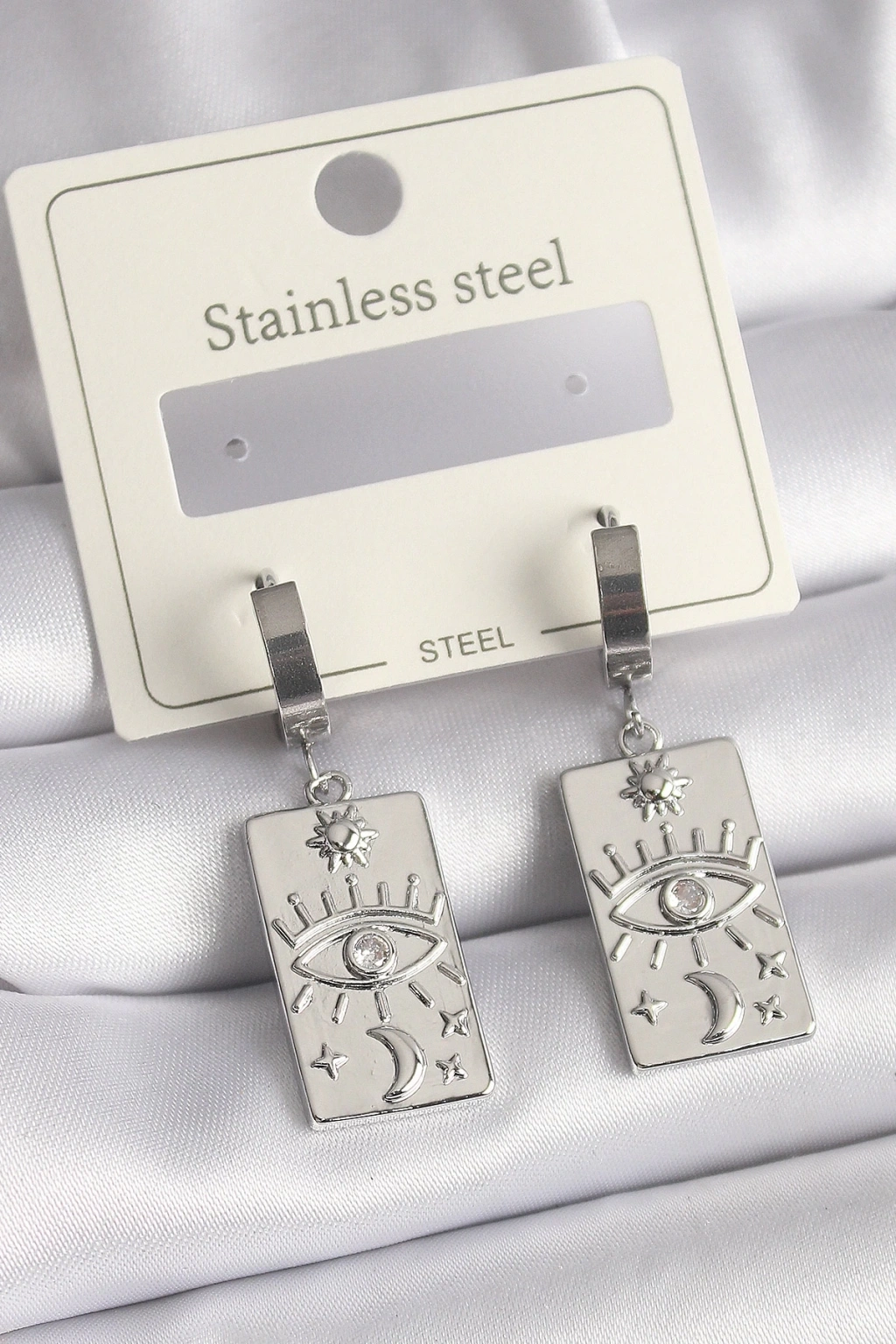 BFS 316L Çelik Gümüş Renk Zirkon Taşlı Göz İşleme Detaylı Plaka Model Kadın Küpe