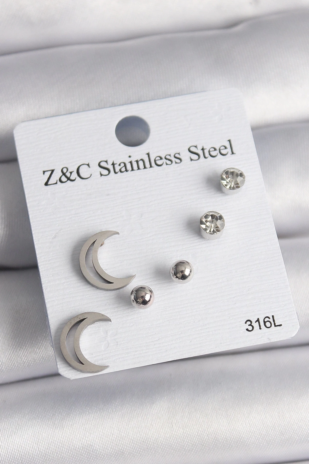 BFS 316L Çelik Gümüş Renk Zirkon Taşlı Hilal Model Kadın Küpe Seti