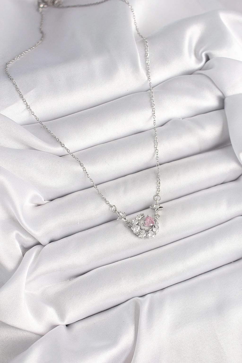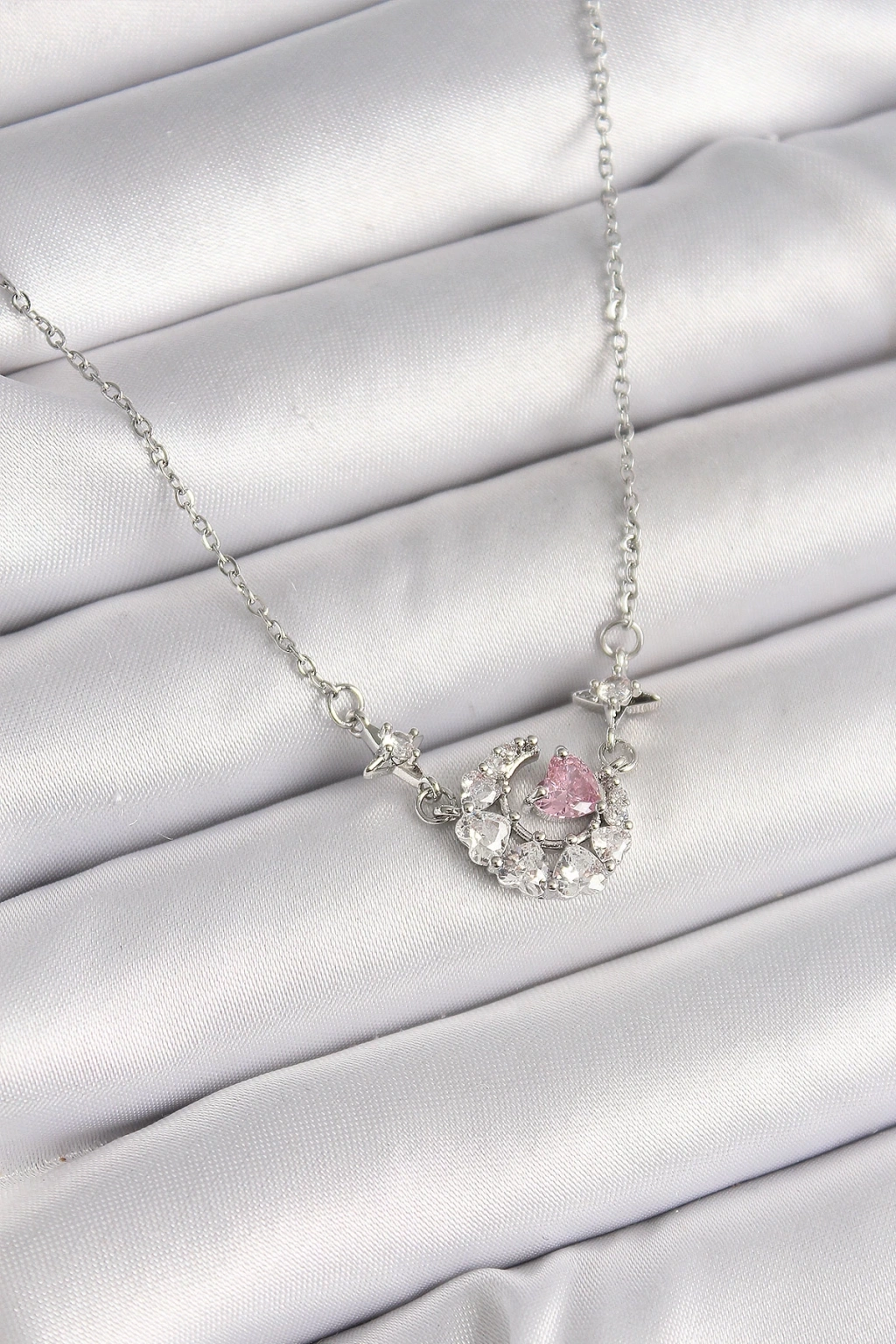 BFS 316L Çelik Gümüş Renk Zirkon Taşlı Hilal Pembe Kalp Model Kadın Kolye
