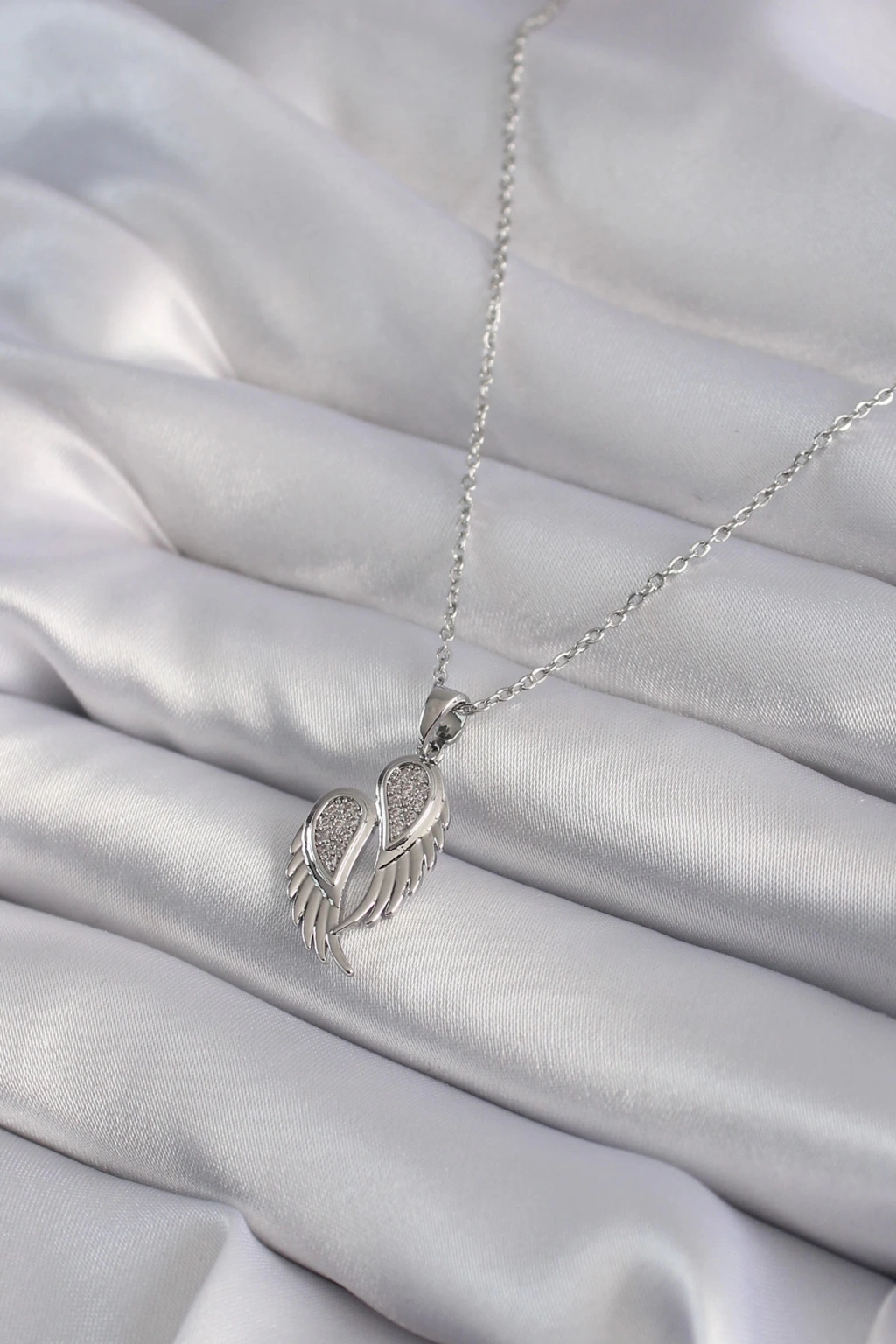 BFS 316L Çelik Gümüş Renk Zirkon Taşlı Kanat Model Kadın Kolye