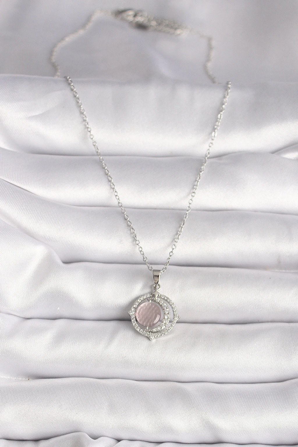 BFS 316L Çelik Gümüş Renk Zirkon Taşlı Pembe Sedefli Hilal Model Kadın Kolye