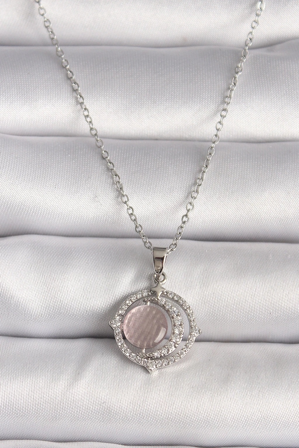 BFS 316L Çelik Gümüş Renk Zirkon Taşlı Pembe Sedefli Hilal Model Kadın Kolye