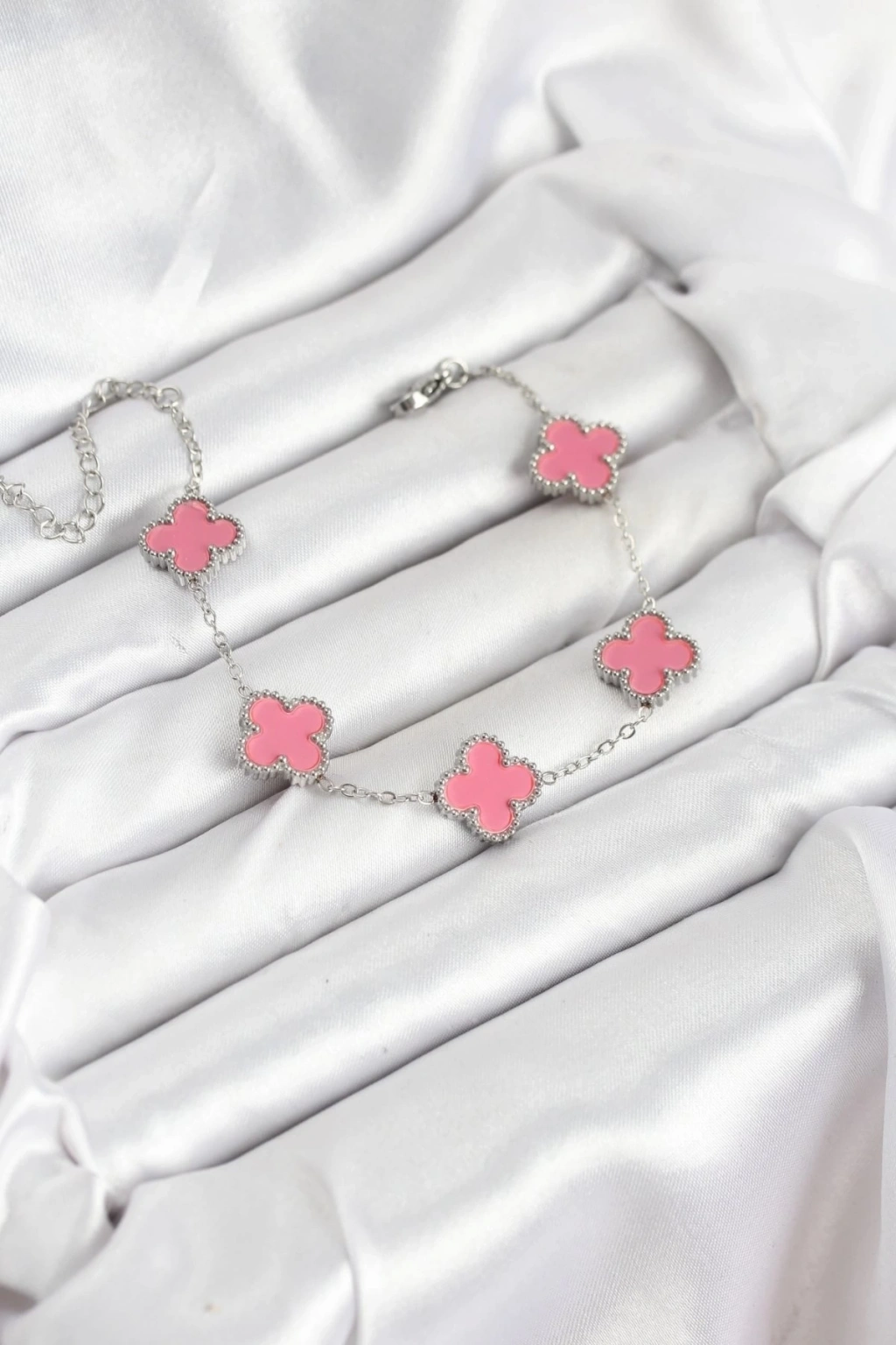 BFS 316L Çelik Gümüş Zincir Pembe Renk Yonca Bileklik