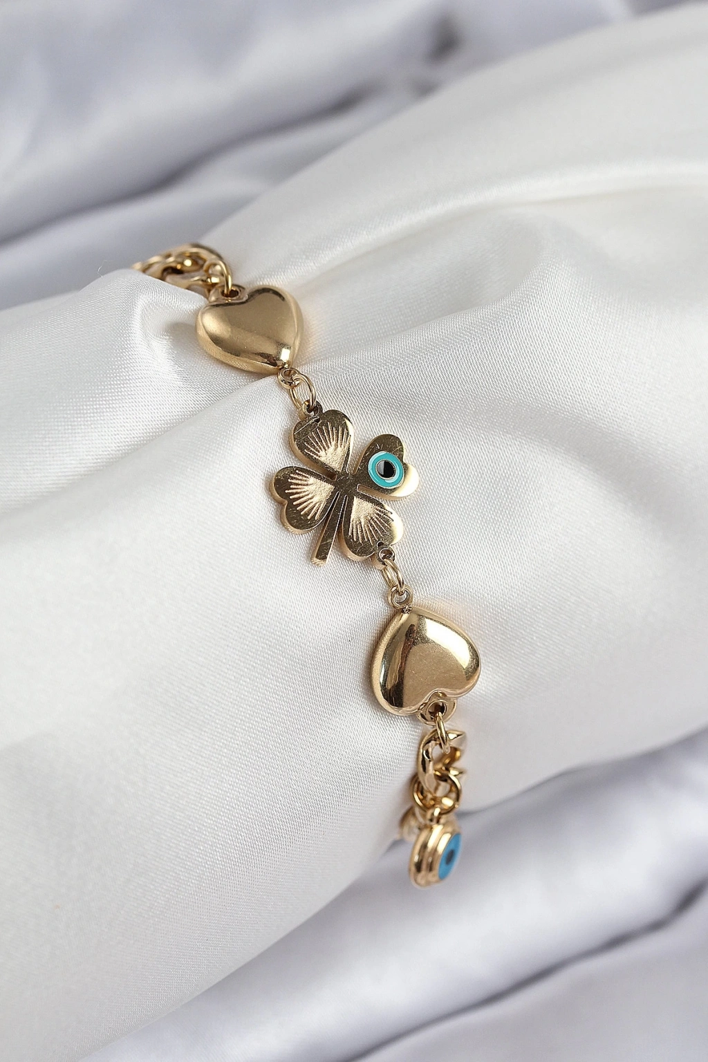 BFS 316L Çelik Nazar Boncuk Detaylı Yonca Model Gold Renk Kadın Bileklik