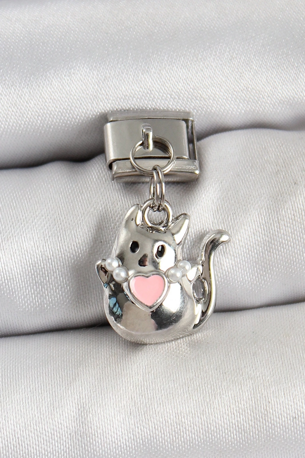 BFS 316L Çelik Sallantılı Kalp Detaylı Kedi Model Gümüş Renk Nomination Charm